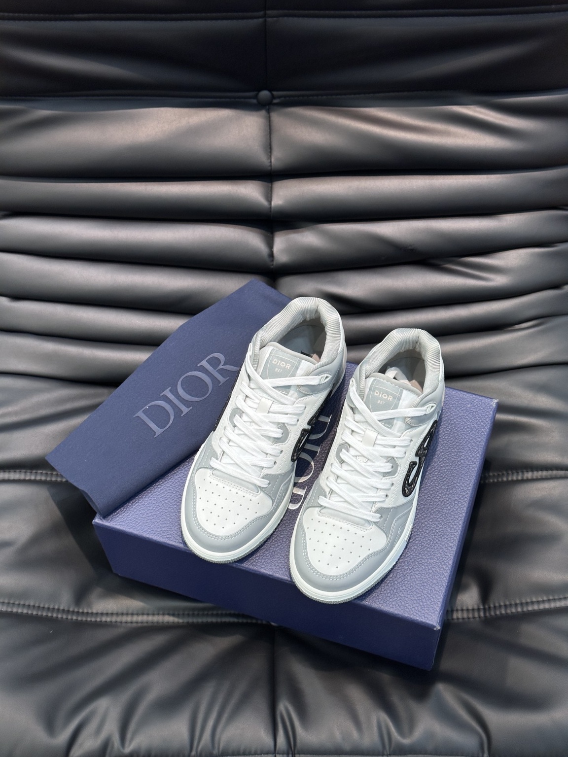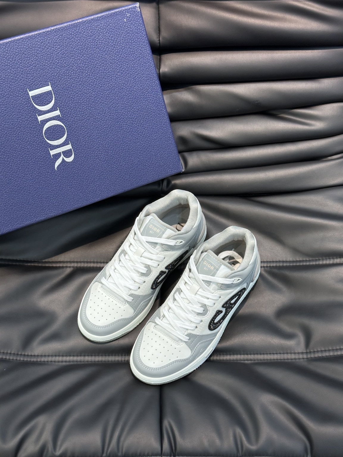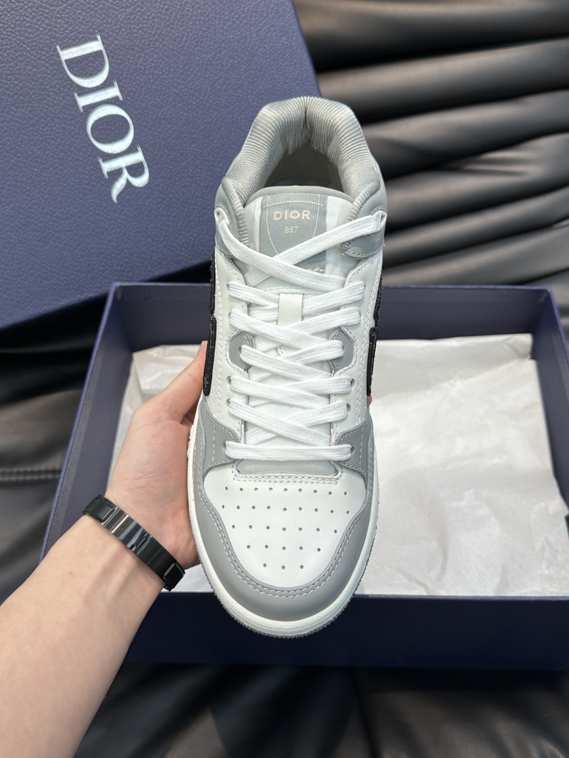디올 커플 B57 미들 스니커즈로 출시 2024 봄 남성복 컬렉션 신상품으로 농구화 디자인을 재해석하여 디올의 시그니처 아이템이 되었음 미들 스트랩 스타일로 컬러 배색의 소가죽으로 세심하게 제작 컬러 스웨이드 콤비와 옆면에 CD 로고가 돋보임 Dior B57 로고로 포인트를 주어 다양한 디테일이 품격을 높였으며 CD 로고 아일렛 디테일, 박음질 라인 러버 파츠가 스포티한 매력을 돋보이게 함 투톤 러버솔, 메쉬 안감, 면 안감 발바닥이 있어 통풍이 잘 됨 다양한 의상에 매치하여 세련되게 연출가능