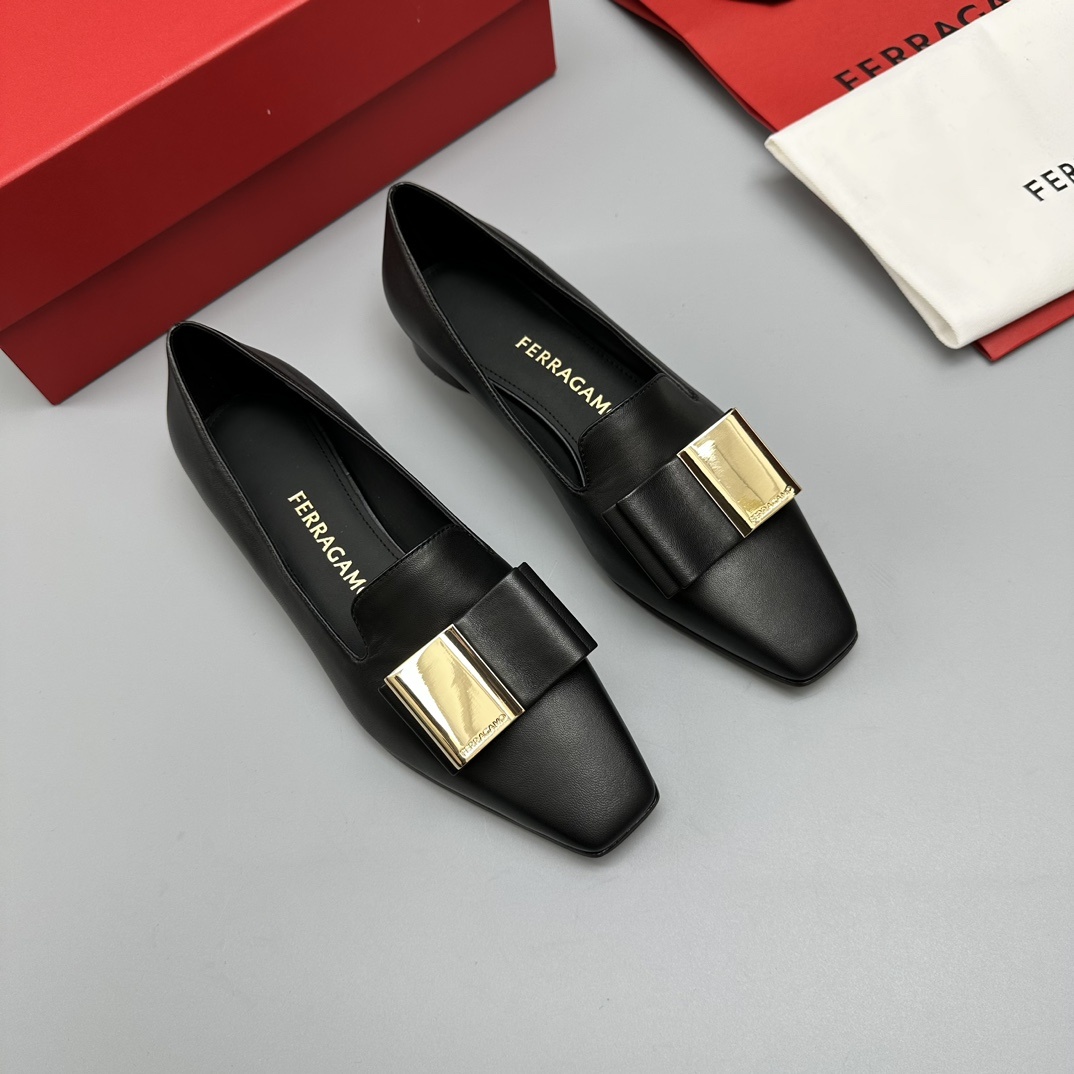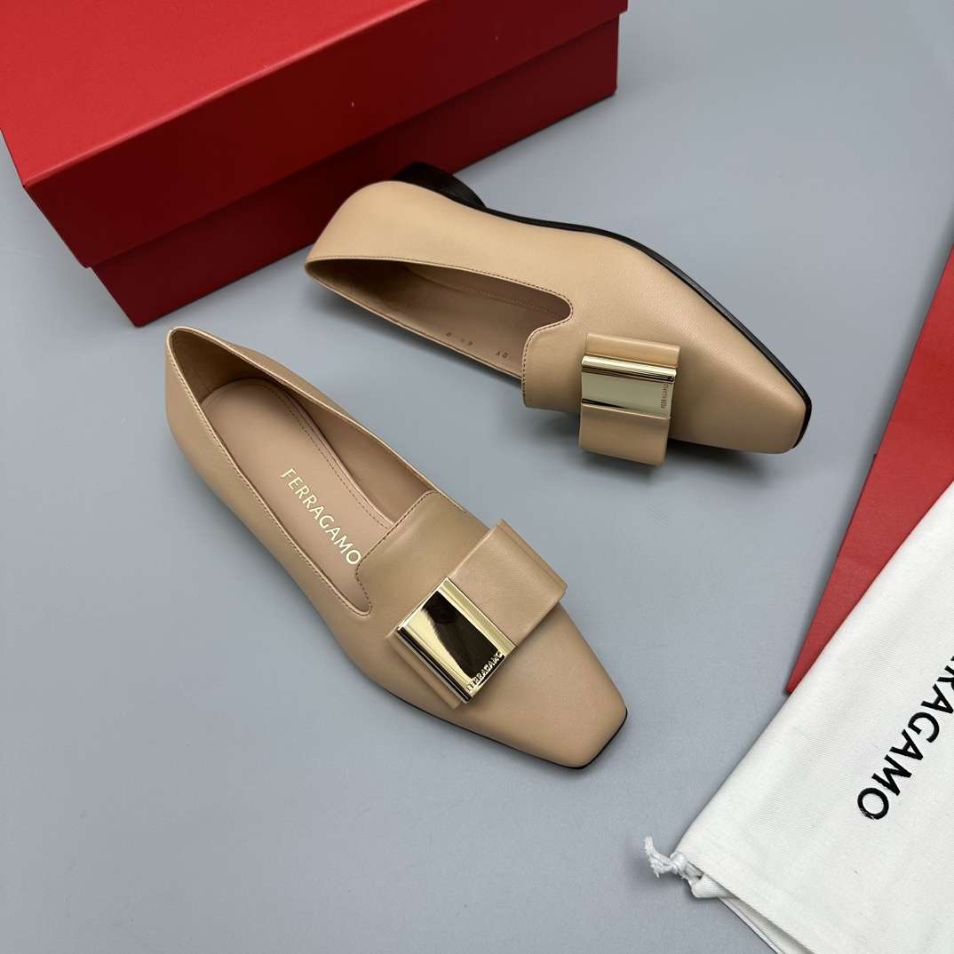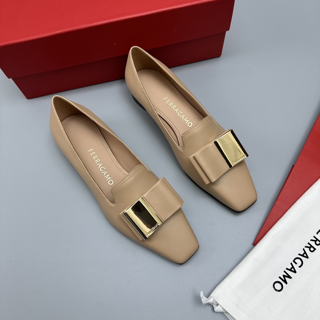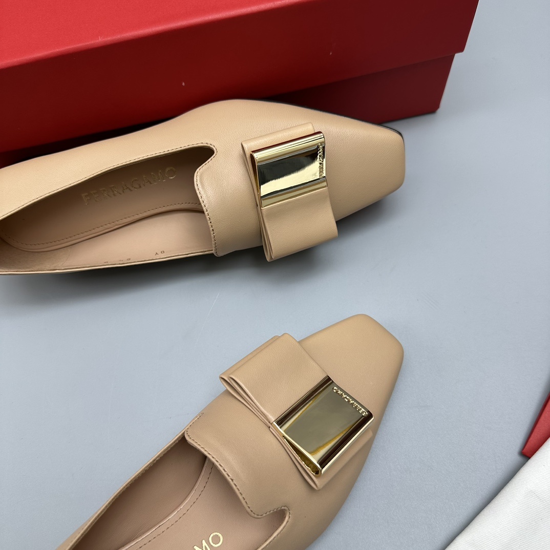페라가모 23ss 신상 스퀘어 토 펌프스 플랫슈즈 최고급 완산 고품질 발등에는 두 개의 리본이 겹쳐져 있고 로고가 새겨진 반짝이는 메탈 장식으로 포인트 겉감 오리지널 양가죽 안감 무스탕 이태리 투톤 가죽 바탕