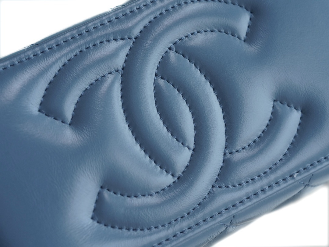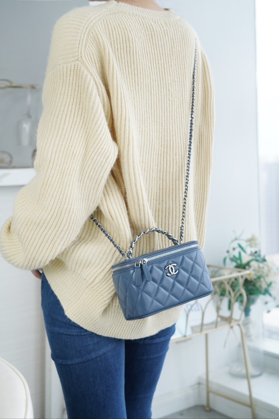 CHANEL 23K 큐빅핸들 롱박스 스모그 블루 가죽은 보들보들한 소가죽으로 마모에 강하고 광택이 있어 질감이 넘치고 손잡이는 체인에 작은 다이아몬드가 박혀있어 더욱 설레고 자체 손거울, 바닥은 큰 더블c로 더욱 세련되어 보이며 스타일리쉬하게 연출할 수 있음 사이즈 : 9.5*17*8cm