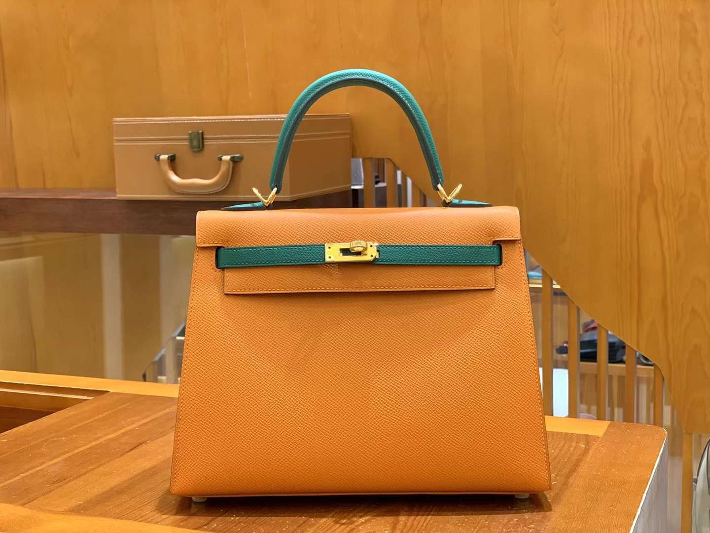 Kelly 25cm 오렌지 블로킹 피코크그린 프랑스 앱송 소가죽 골드 버튼 오리지널 밀랍 실 최고급 핸드 스티치