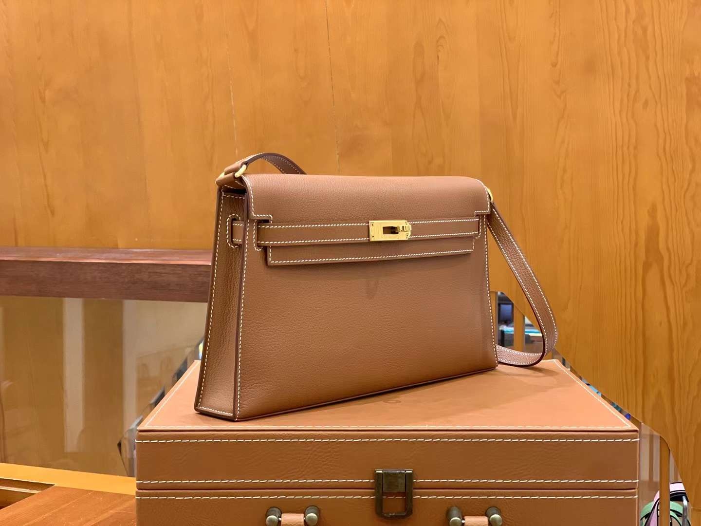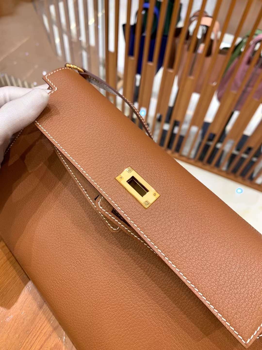 켈리 엘란 황금갈색 염소가죽 골드단추 오리지널 밀랍실, 최고급 핸드 스티치 size 27.5 15 5cm