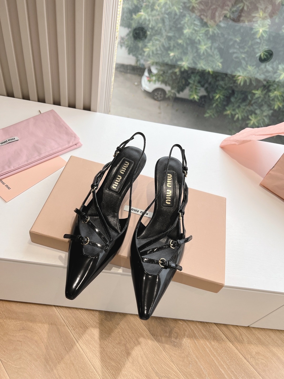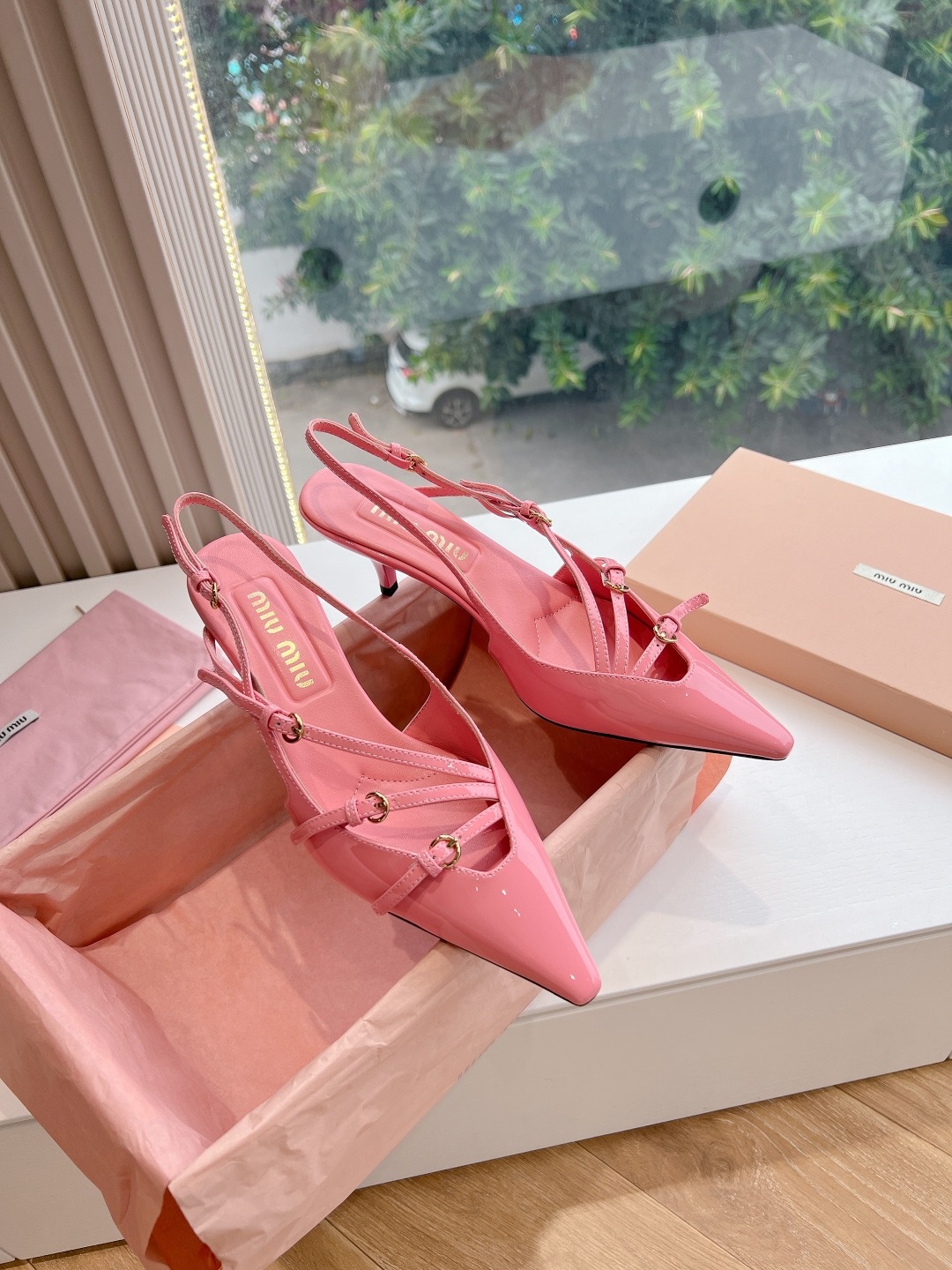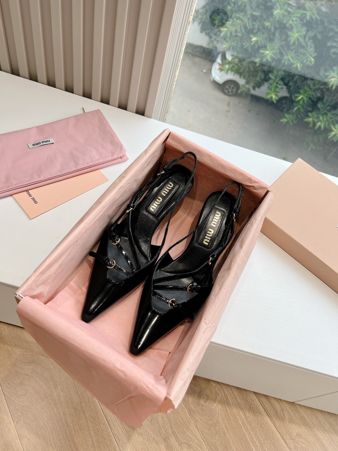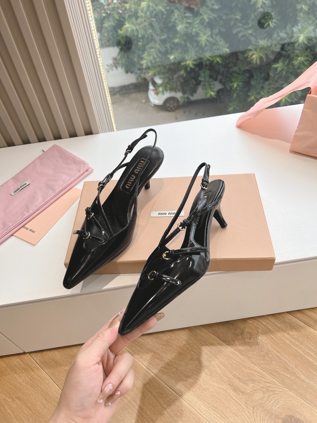오리지널 1대 1 복각 프리미엄 미우미우 24SS 꼬깔 단화 슬링백 펀칭팁, 리본, 섹시함까지 고루 갖춘 힐 겉감: 수입 에나멜 안감: 양가죽 굽: 약 3CM