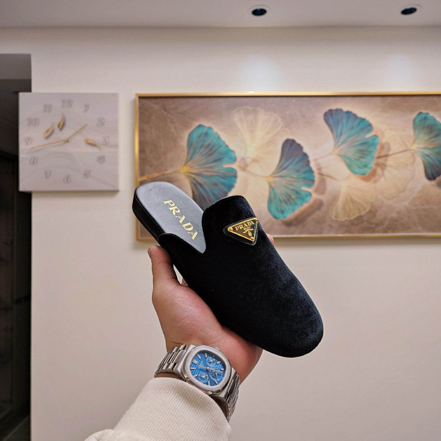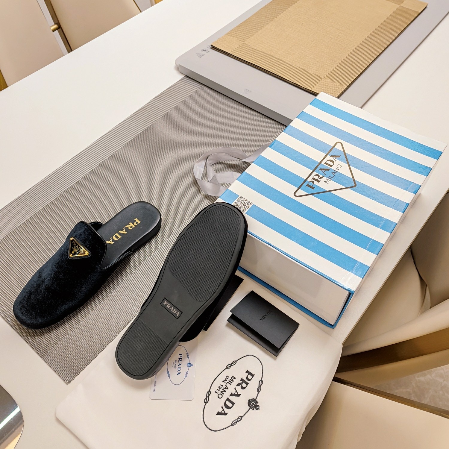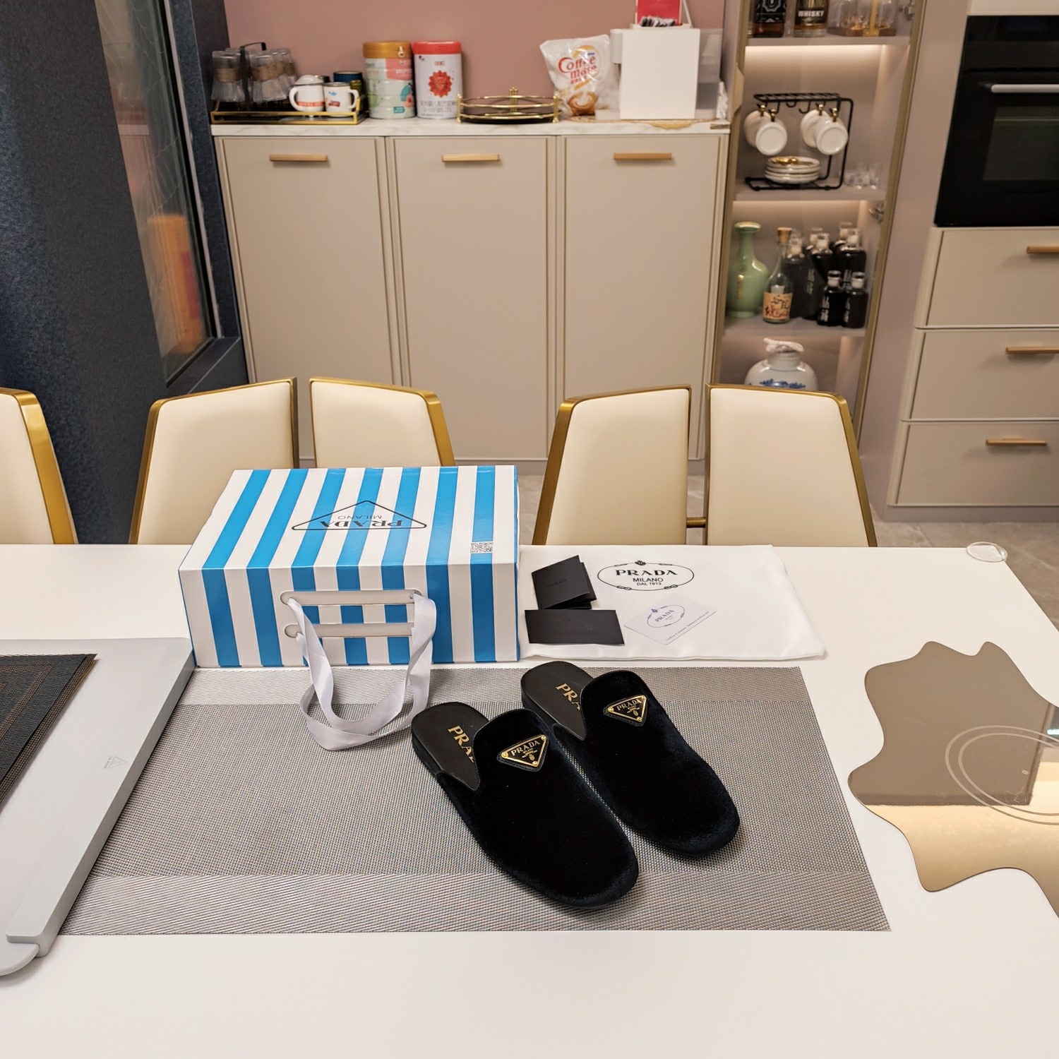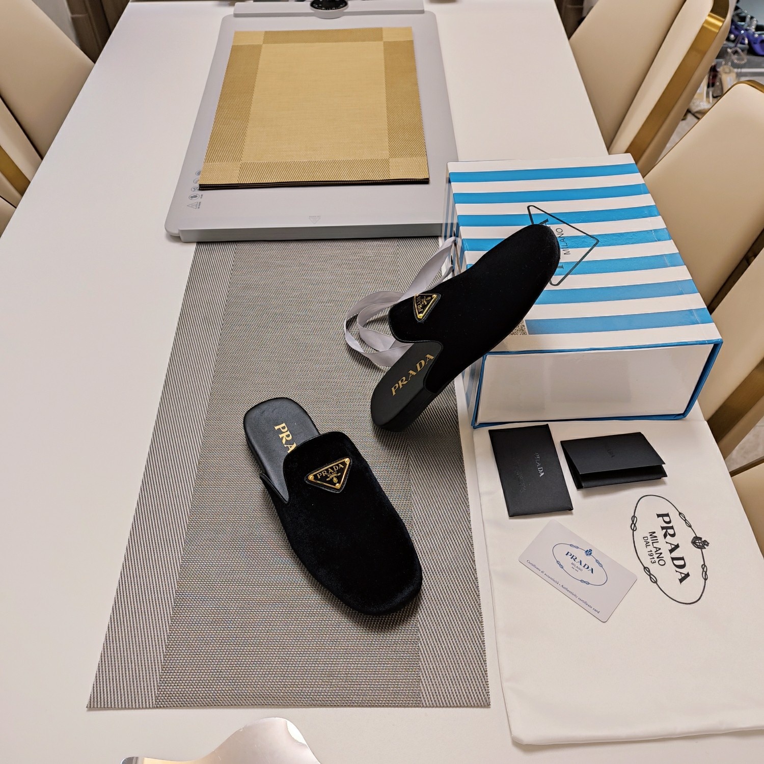 최고급 패키지 최고 버전 프라다 2024SS 최신 플랫 슬리퍼 오리지널 실크 벨벳 간단해 보이지만 제작이 매우 어렵고 청결도가 매우 높으며 제작과정이 오염률이 높고 오리지널 앞코 모양 골조+클래식 금속 철물 삼각철 로고가 고급품인지 아닌지는 세부 사항을 비교해 보면 알 수 있음 이태리 공예 중 통굽으로 제작되어 절대적인 튼튼함 단독 24년 블루 스트라이프 매장 멤버십 한정 자석 케이스 포장 실켓 벨벳 + 양가죽 안감 + PVC 성형 필름