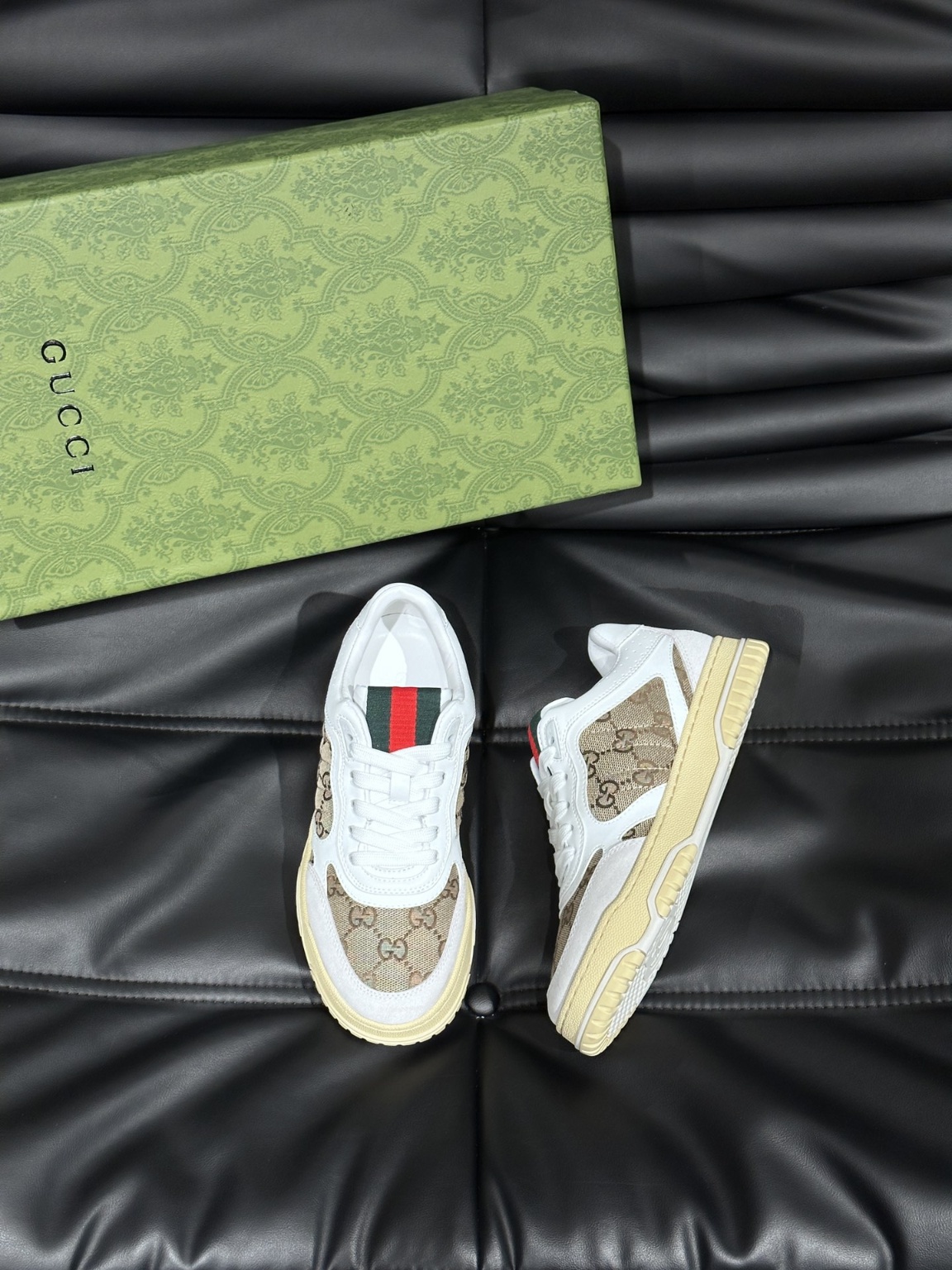 Gucci 구찌 Re-Web 컬렉션 커플 스트랩 가죽 운동화 Sabato De Sarno가 Gucci를 위해 만든 최초의 운동화 Re-Web 컬렉션은 브랜드 시그니처 스트라이프를 새롭게 연출 시그니처 클래식한 GG 캔버스와 화이트 컬러의 가죽으로 제작 다양한 브랜드의 클래식한 디테일을 장식한 새로운 스니커즈와 밝은 적록색 스트랩 토 슈즈를 매치