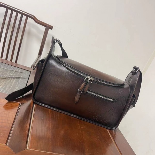 BERLUTI Barrel Bag Scrito 패턴 가죽 메신저백 베네지아 소프트 소가죽, 스크리토 러브레터를 사용 무늬 조각, 핸드메이드 고법 컬러링 공법 외부 특징: 원 지퍼 앞 포켓, 탑 링 더블 지퍼 가방 앞쪽 스크리토 패턴 조각, 가방 양쪽에 포켓, 스트랩 내부 특징 : 지퍼포켓 1개, 플랫포켓 2개 사이즈 : 높이 17cm - 가로 36cm - 세로 16cm
