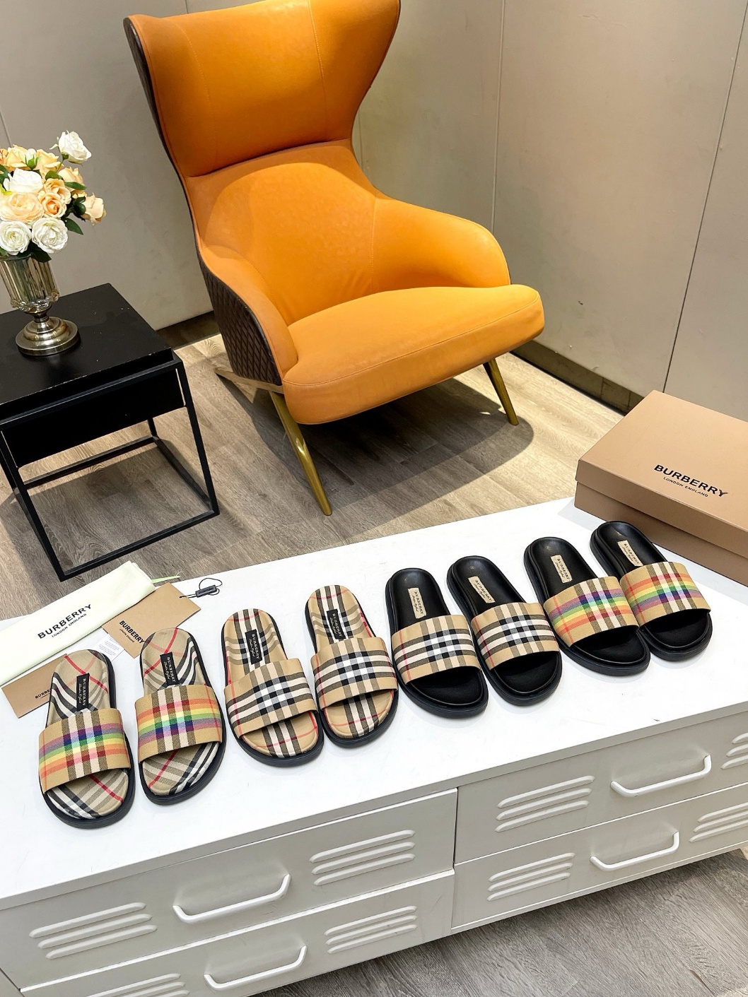 버버리 클래식 라인업 레인보우 체크 슬리퍼 원판복각, 단독 오픈 겉감: 린넨 면 안감: 양가죽 대창: 고무 10PU 포장: 원판포장