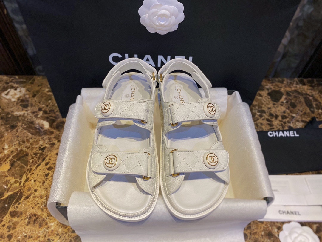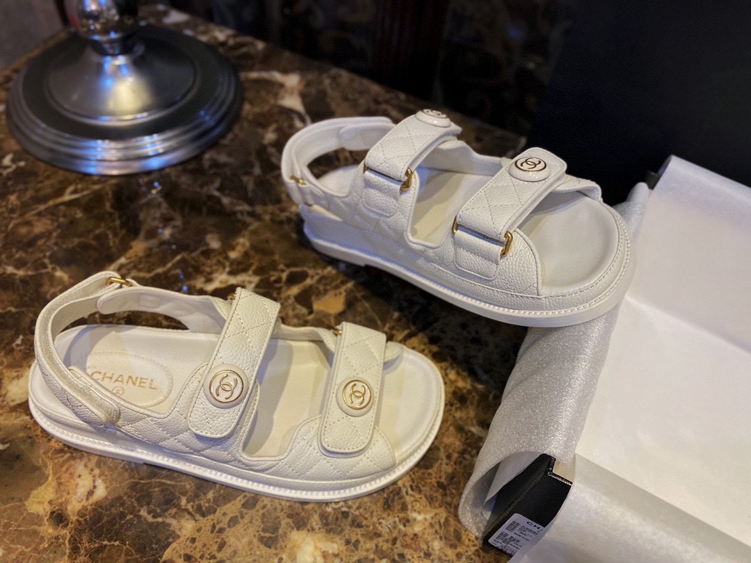 샤넬 클래식 아쿠아 샌들 화이트 소가죽 드롭 원재료 철물 감상 무늬 컬러 질감 통통 만점 안에서부터 바깥까지 디테일한 부분까지 정교하게 다듬어 완벽함