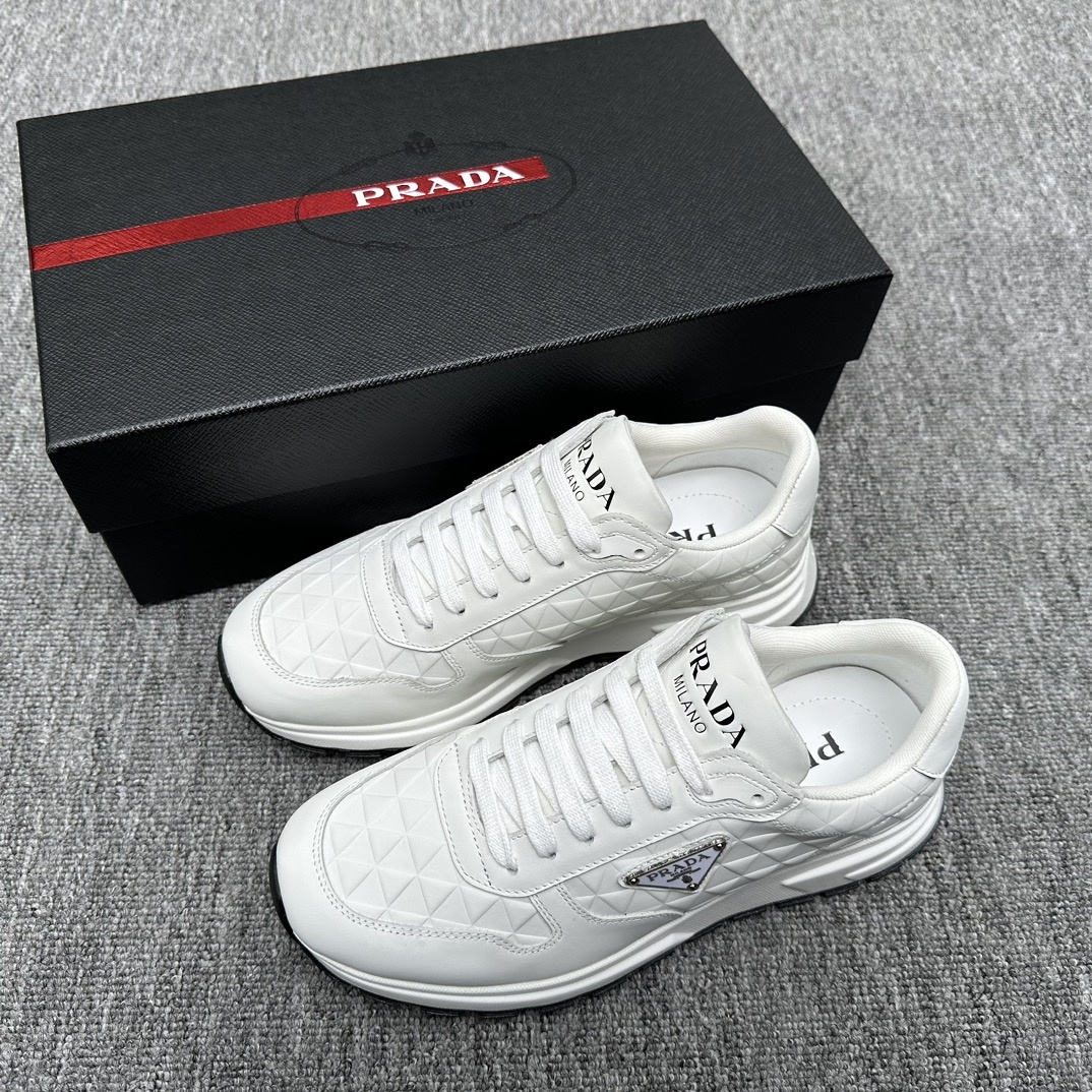 프라다 PRAX 01 운동화 남성 우아하고 창의적인 디자인과 프라다 라인의 전형적인 소재 신발은 해양 플라스틱 재활용품을 사용하여 만든 혁신적인 Re-Nylon 재생 나일론과 유광 가죽으로 제작 참신하고 스포티한 느낌을 주는 삼각형 로고로 포인트 트레드 무늬 러버 통굽으로 오버핏 믹스매치에 매력 부여