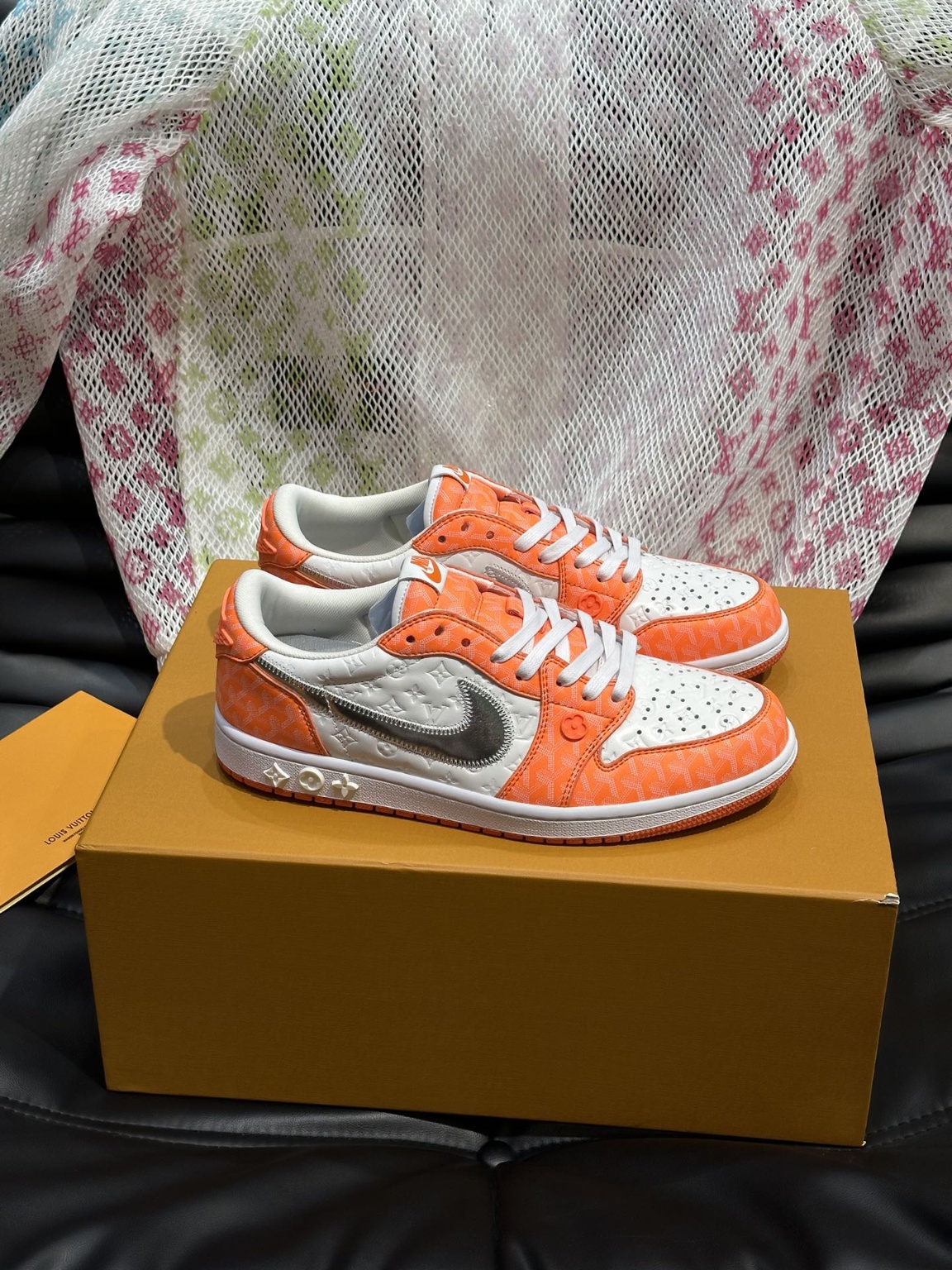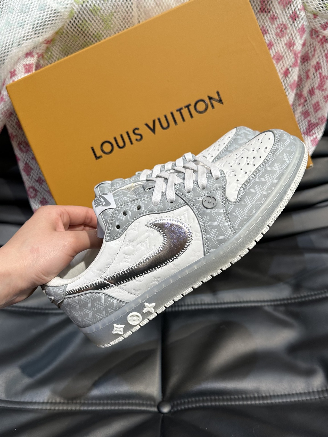 LV x nike 콜라보레이션 로우탑 스니커즈 앞판 소가죽 패치 오리지널 캔버스로 세심하게 제작 옆판 콜라보레이션 로고 장식으로 투톤 컬러의 러버솔과 뒷판 굽에 브랜드 아이코닉 디테일로 품격을 높였음 역동적이고 모던한 분위기를 자아내는 세련된 디자인