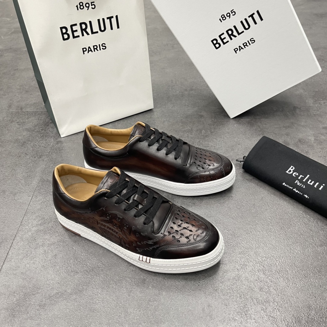 Berluti PLAYTIME PALERMO 운동화 시트형 가죽 구두에 수작업으로 틈새 스포츠 표면 처리 메탈코와 다이아몬드 아일렛 밑창에 스크리토 패턴 장식 반전 컬러의 면 끈과 구두 표면을 수입 가죽으로 수작업으로 색칠을 반복해 왁스칠을 해야 이 질감이 생김 속은 원색의 송아지 가죽 편안함이 최고 단독 몰드오픈 TPU 투톤 아웃솔