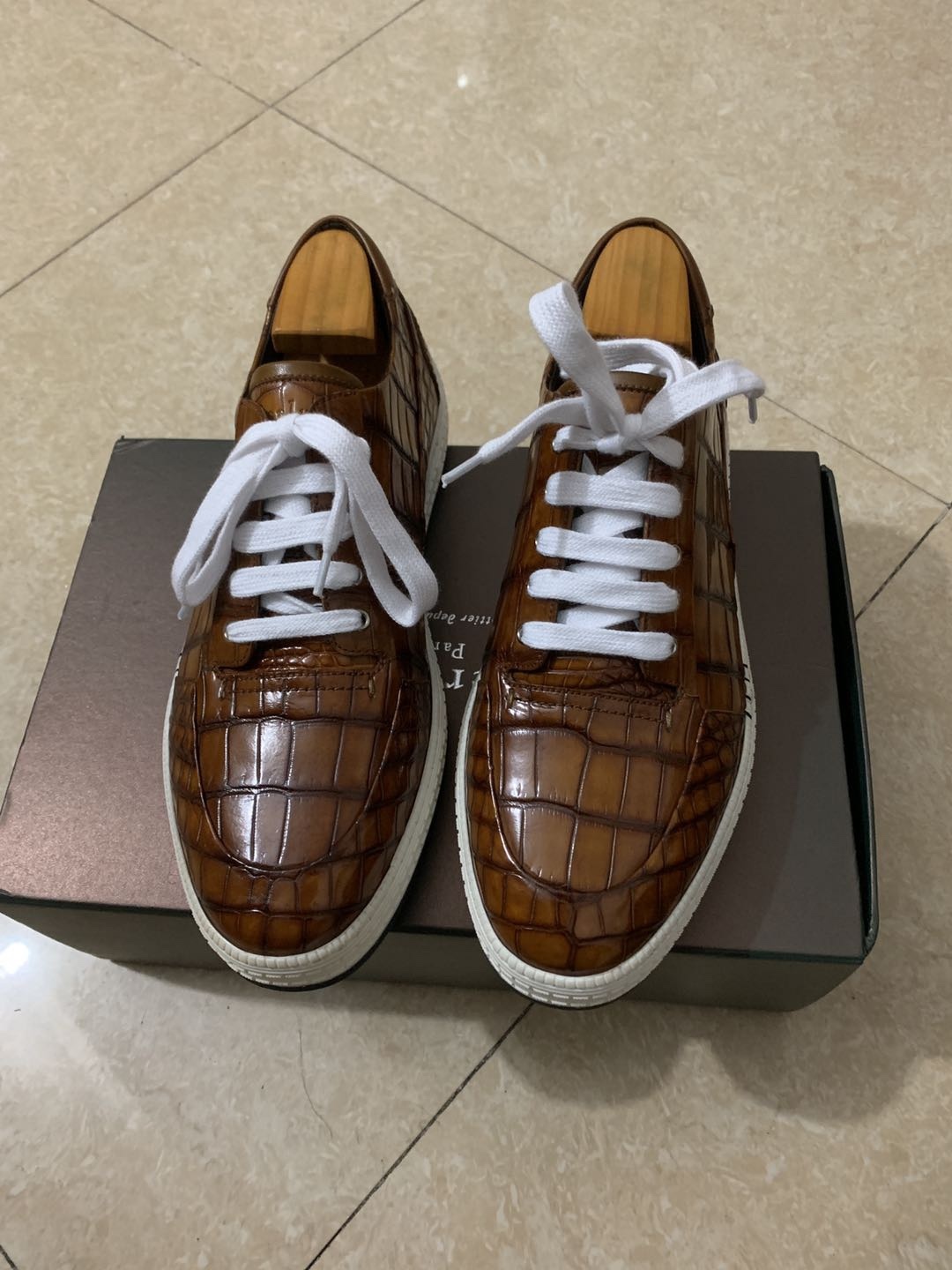 Berluti Playtime Palermo 악어가죽 스니커즈 최고급 나일악어 가죽배아, 송아지 가죽 안감 오리지널 재료, 순수 천연고법 핸드메이드 컬러링 고품질만이 브랜드 소울을 구현함 외부 특징: 1피스형 구두, 구두에 수작업으로 박음질 한 것 표면 처리: 메탈 메쉬와 마름모꼴 펀칭, 밑창에 스크리토 장식 눈에 띄는 광택, 대조색 면화 끈과 신발 표면