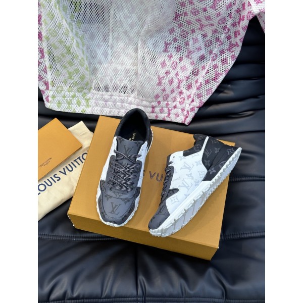 루이비통 런 어웨이(Run Away) 운동화 1단 소가죽으로 제작된 런 어웨이 운동화 쐐기형 고무창 지속 런닝화, 모노그램 플로럴 LV 이니셜 혀, 루이비통 파리 로고로 뒷부분을 장식 브랜드 로고 면 깔창과 함께 메쉬 안감 뒤꿈치 소가죽 패치워크로 통풍이 잘됨