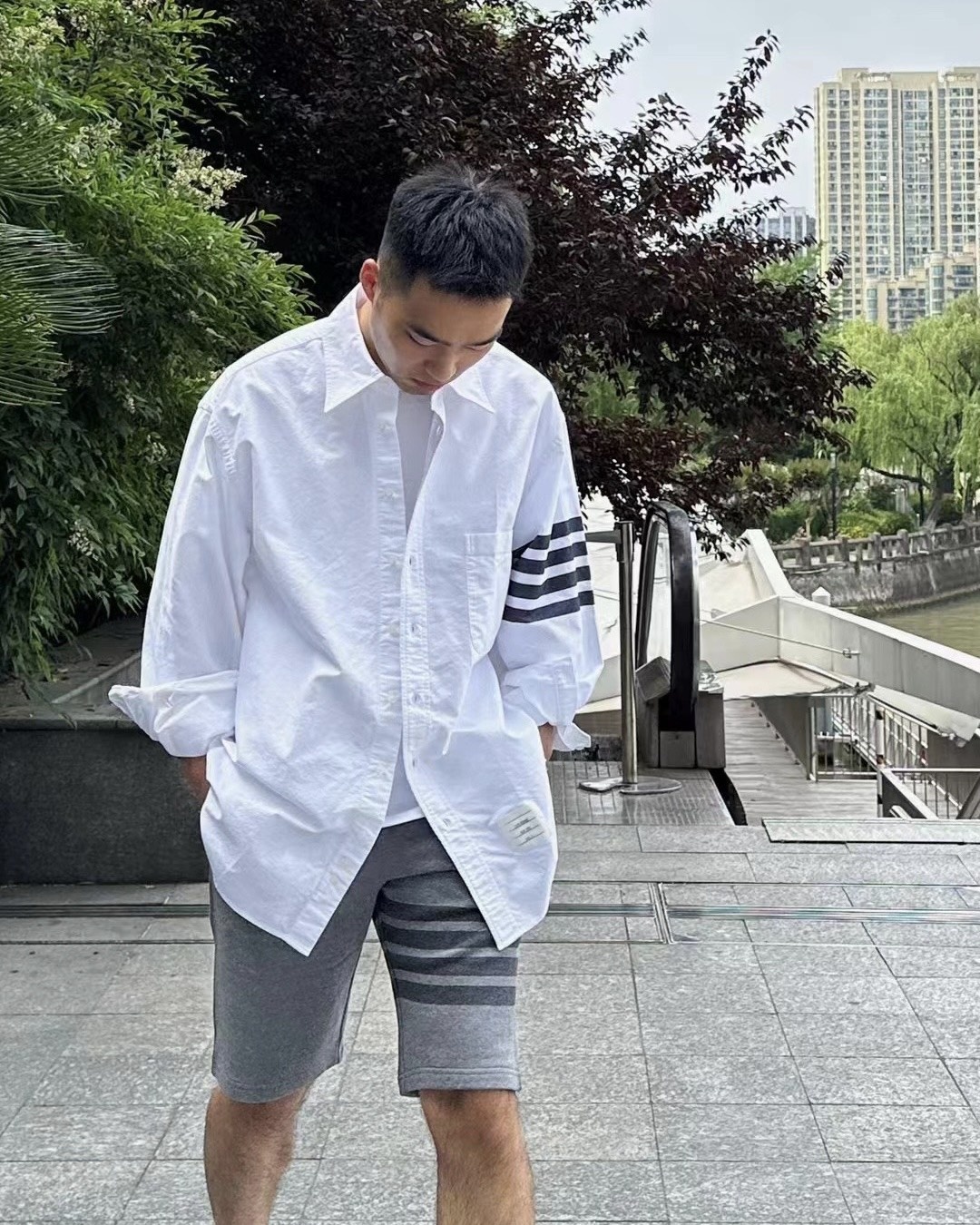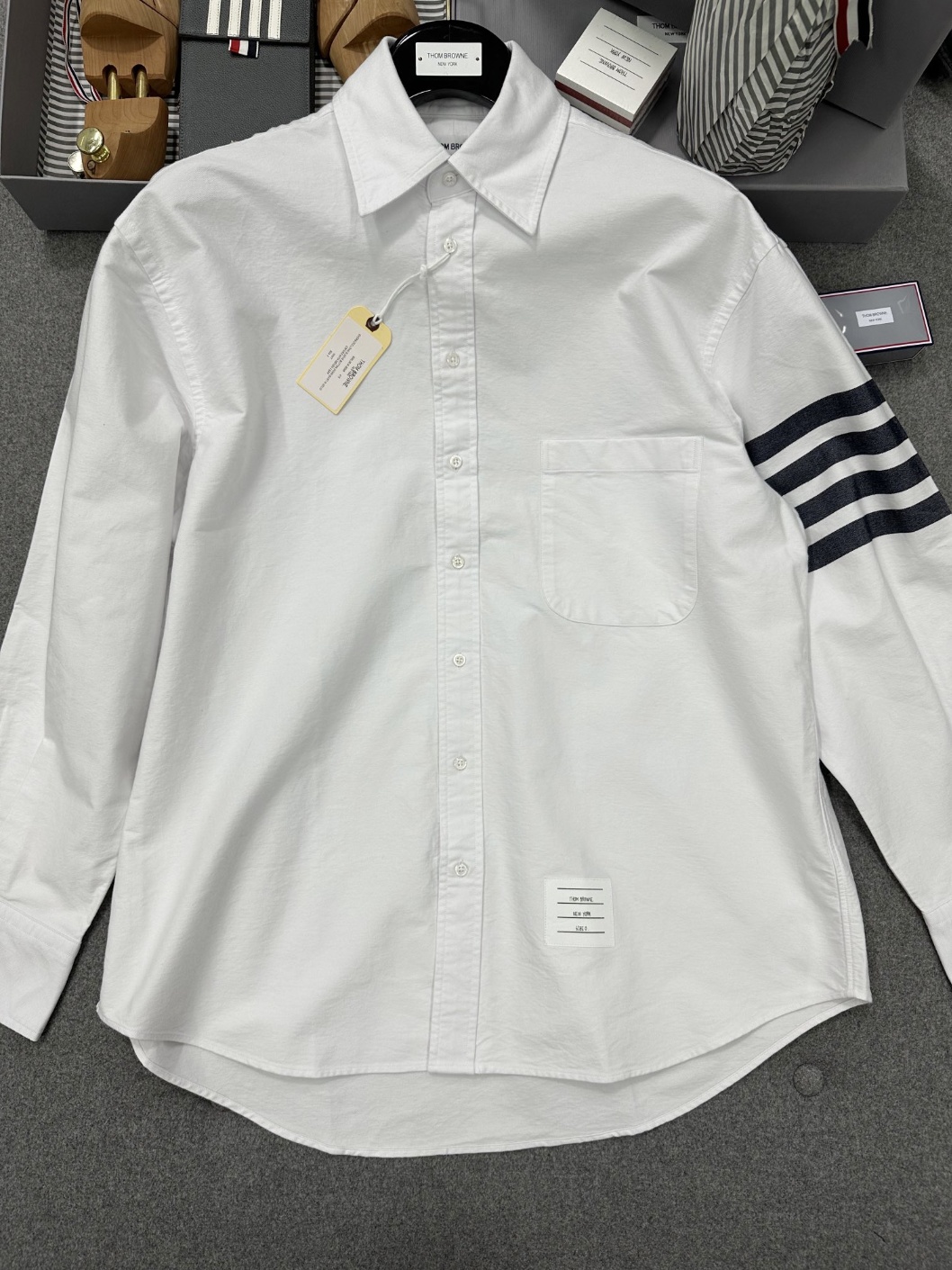 톰브라운 클래식 네줄 스트라이프 옥스퍼드 박시 셔츠 원단을 두 달 정도 주문 제작하여 일반 옥스포드 셔츠 원단보다 도톰하게 제작되고 이런 종류의 실에는 빗이 들어 있고 천의 알갱이가 또렷하고 입체감이 강함 네이비 네 줄무늬를 매치하여 온화한 귀공자 디자인에 핏이 빳빳하며, 셔츠의 수공예는 완벽함 안감은 모두 셔츠의 최고 표준 한 땀 한 땀 셔츠의 아름다움과 스타일은 비교할 수 없음 하이엔드 플레이어 입하