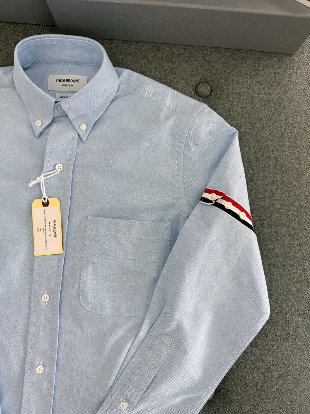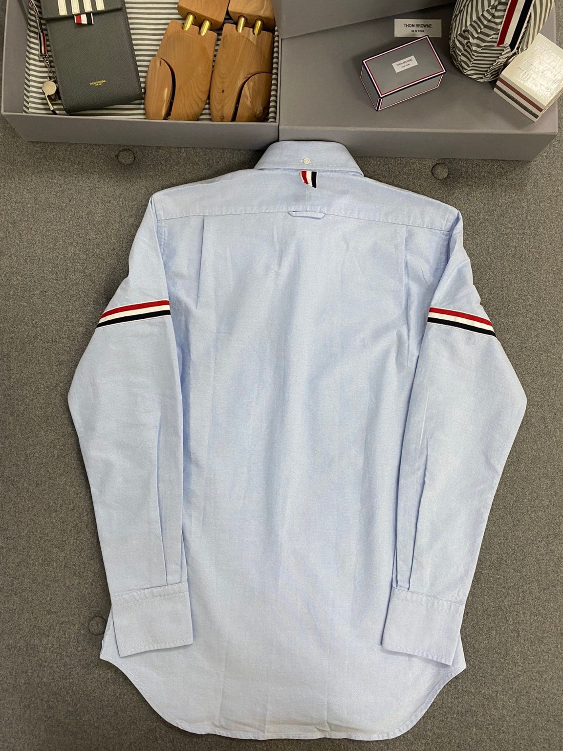 톰브라운 클래식 옥스퍼드 셔츠 새롭게 업그레이드된 옥스포드 소재 봄여름 가장 편안한 스카이블루, tb스타 제품으로 심플하고 깔끔하며 캐주얼하고 편안한 착용감 수입 옥스퍼드 방적 원단 양소매 로고 스트랩으로 장식하여 보디 핏이 살아있고 모두 오리지널 맞춤 자개 버클로 안쪽과 가장자리를 처리하였으며 밑단 네모난 표지는 반드시 3선 기관차이며 평차기가 아닌 봉제로 디자인