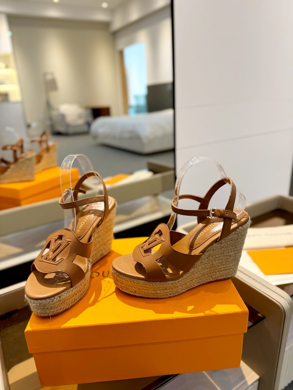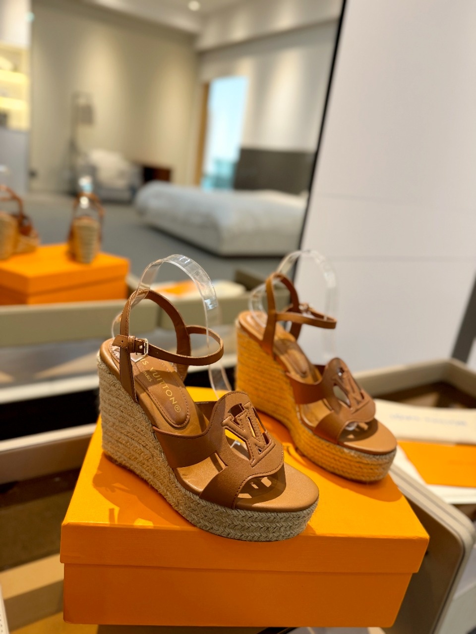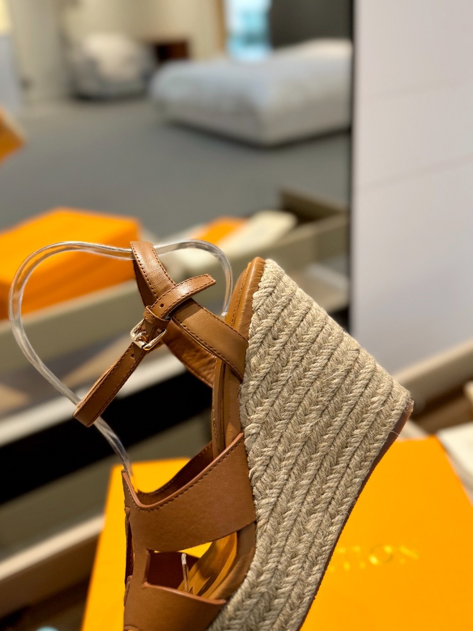 LV 타닌 시리즈 최신 워킹화 통굽 마끈샌들 홍콩 오리지널 구매 1대1 몰드 가죽은 오리지널 데님에 구제 왁싱 소가죽 안감 쿠션 통무스탕 워터프루프 기술 신발의 표면은 주문 제작으로 작업 시간이 많이 소요됨 굽: 뒤11cm 앞6cm