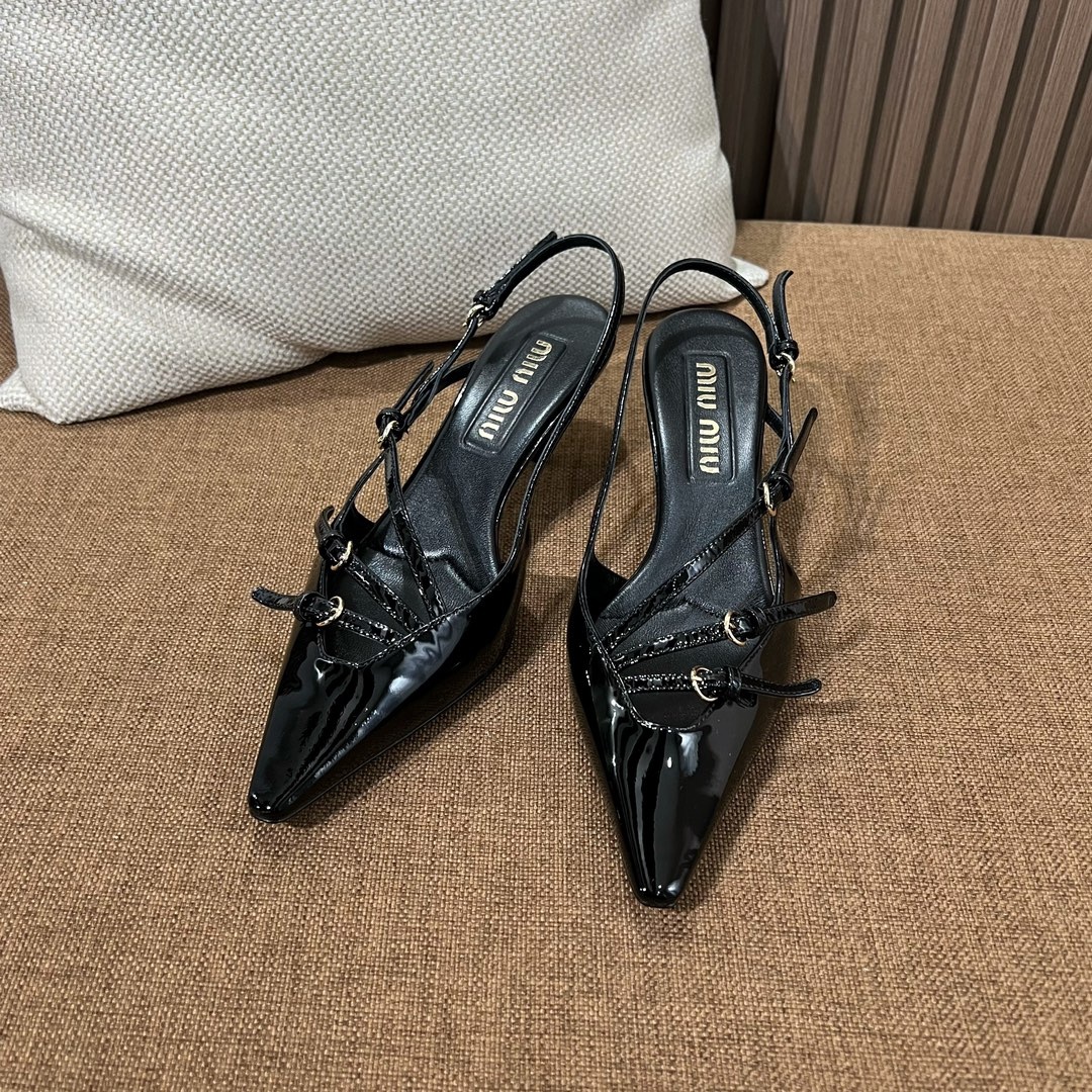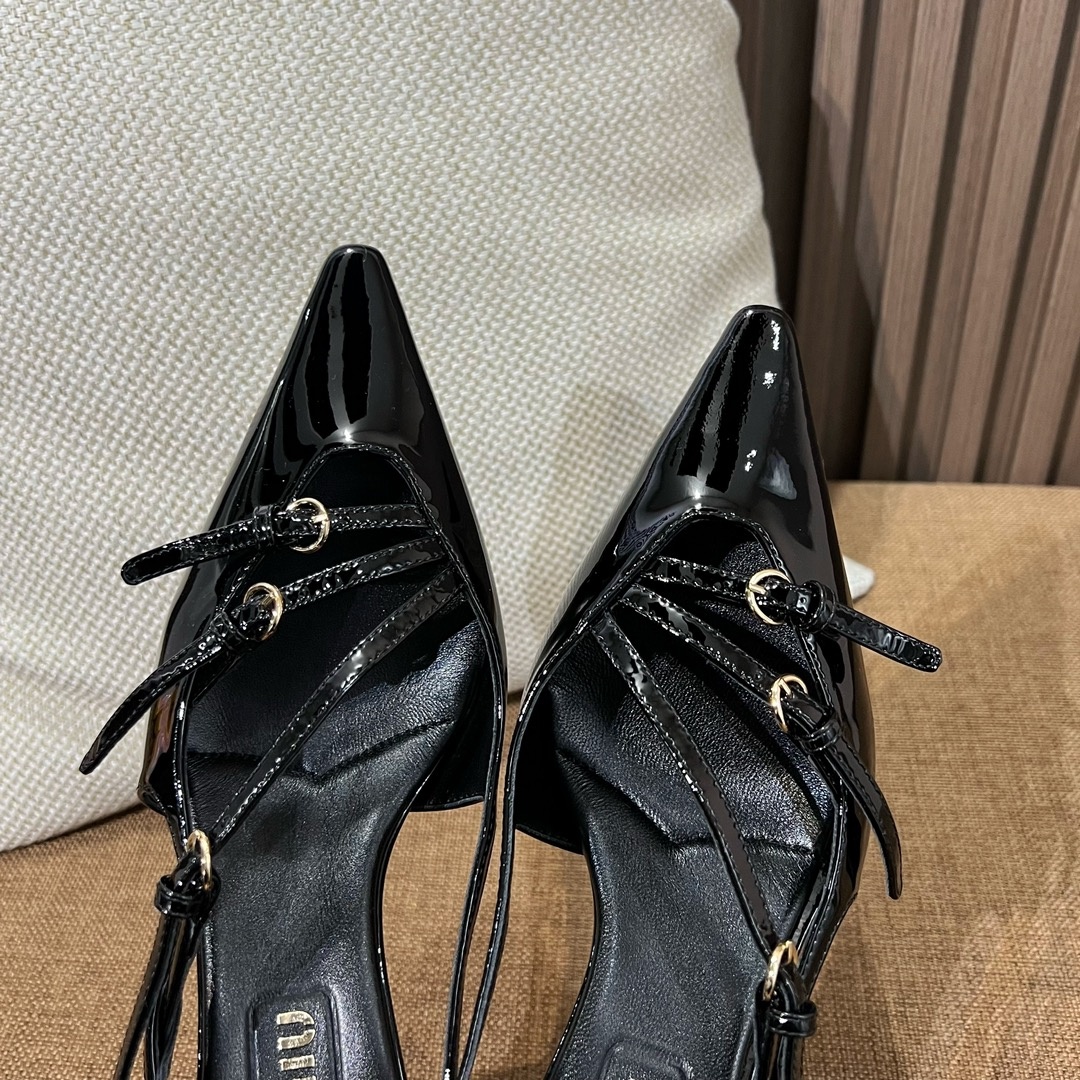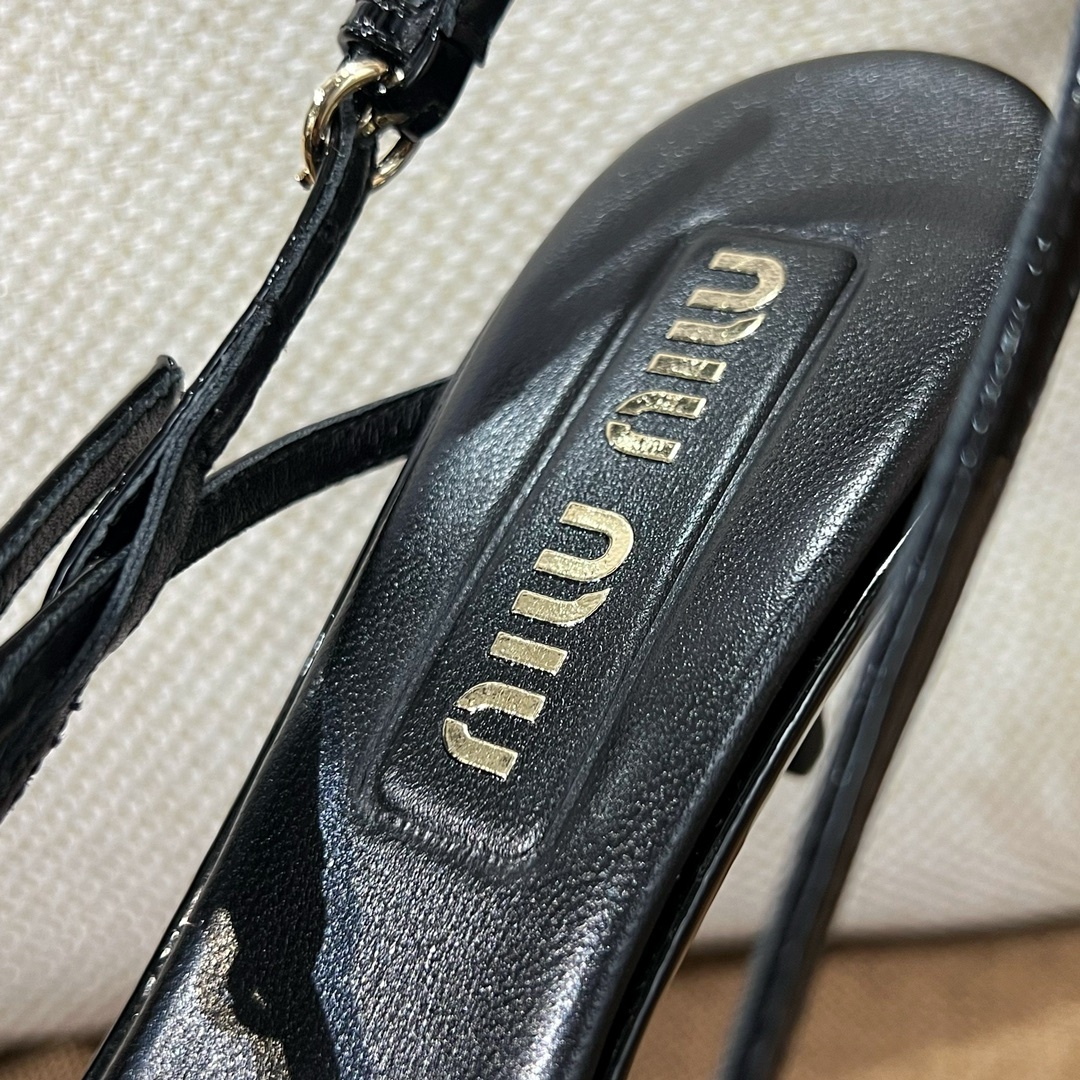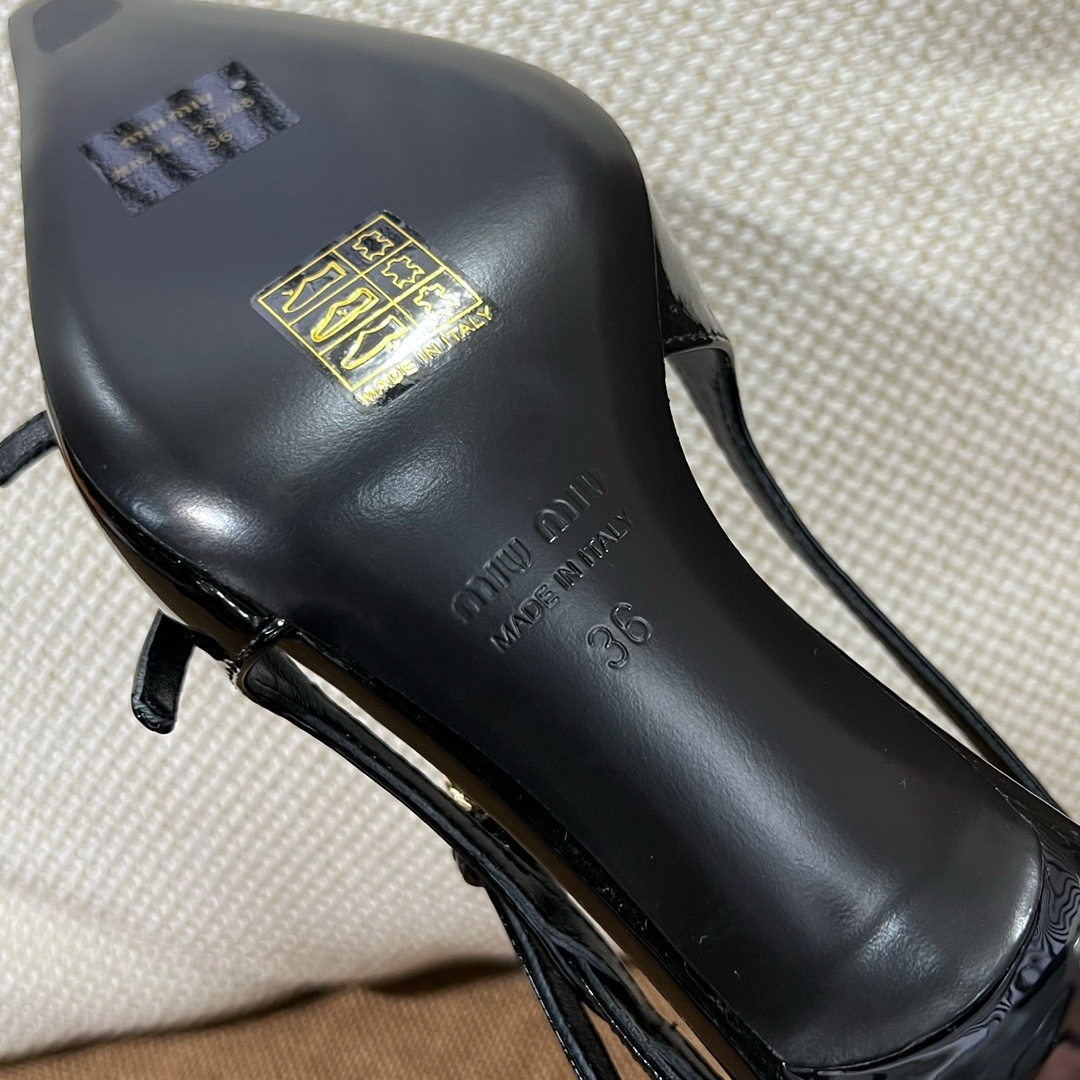 미우미우 신상 스틸레토 스리밴드 고양이 굽샌들 슈퍼 페미닌 슈즈, 유광 소가죽 페이던트 사용 부드러운 양가죽 안감, 편안한 통기성 이태리 수입 A급 가죽 플랫폼 굽: 5cm