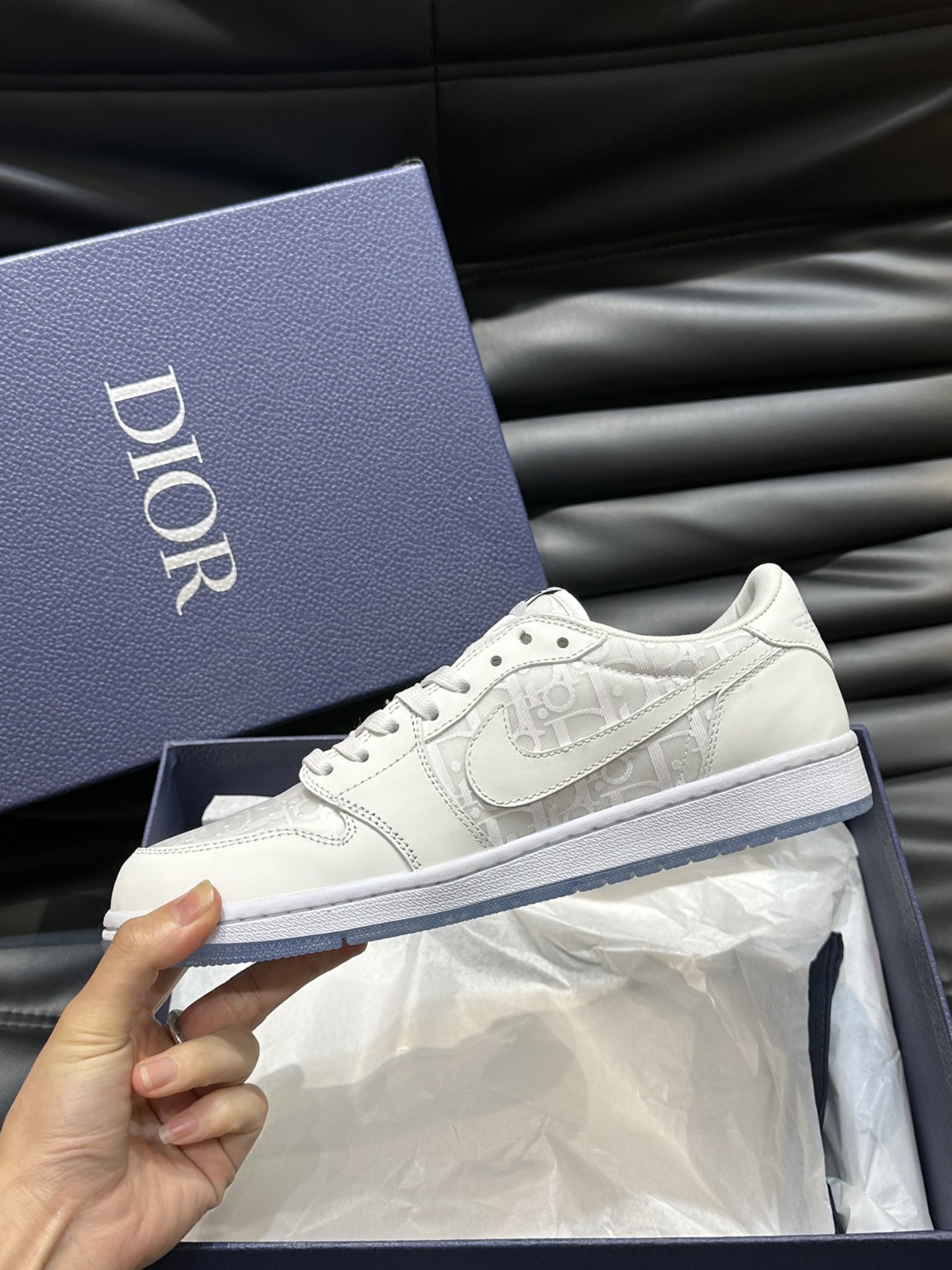 Dior X nike 콜라보레이션 스니커즈 수입 올오버 캔버스 스티치 레이어드 소가죽 소재로 제작 사이드 네임 프린트 로고 장식과 투톤 컬러의 고무창 뒷면 구두창, 굽 부분에 브랜드 아이코닉 디테일 역동적이고 모던한 분위기를 자아내는 세련된 디자인