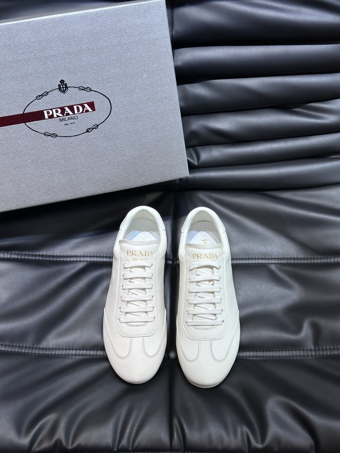 프라다 2024 봄여름 신상품 남성 프리미엄 운동화 스타일리쉬하고 모던하며 스포티한 스타일과 세련된 디테일이 어우러진 운동화 가죽 소재에 러버솔과 아웃솔에 이니셜 로고를 엠보싱하여 심플하고 모던한 아이템