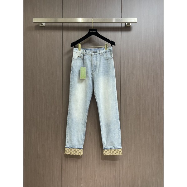 구찌 2024 신상 롤업 데님 팬츠 원단 신축성, 허리 가죽 레터링 심플 로고 디자인이 깔끔하고 수입 타닌 소재 질감이 탁월하며 친환경 워싱 공법 컬러가 매우 자연스럽고 멋스러우며 클래식한 오봉지 디자인, 전체적으로 톤이 고급스러움