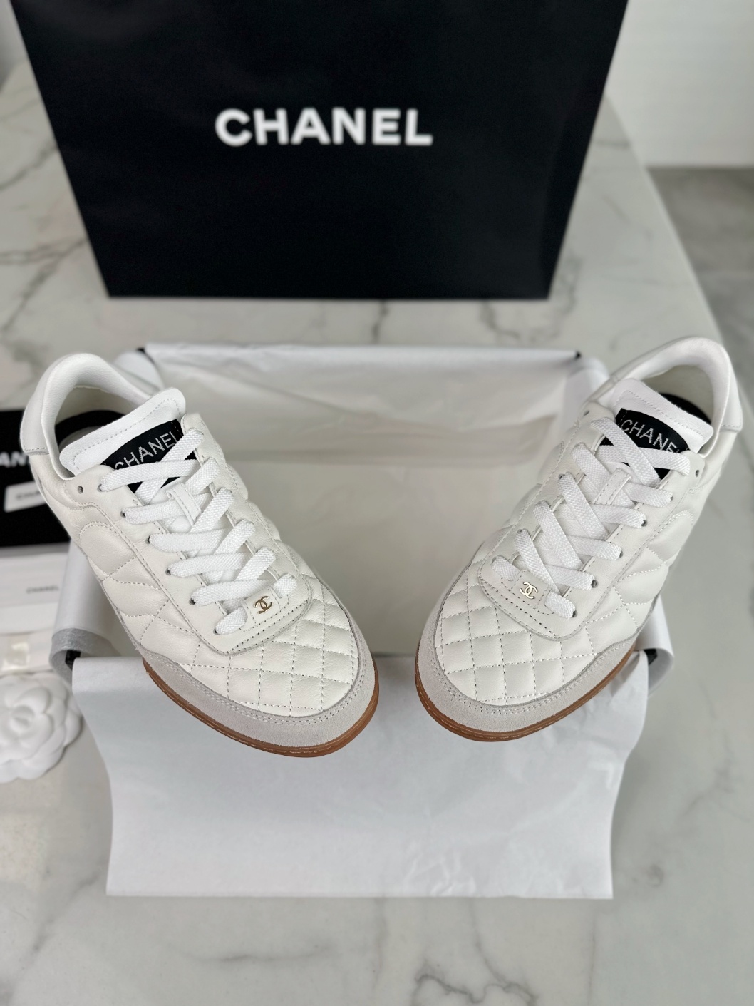 샤넬 23k 화이트 트레이닝화 화이트 컬러의 수입 송아지 가죽 클래식한 퀼팅 공법으로 톤온톤 스웨이드 앞코, 톤온톤 TPU 카라멜+화이트 컬러의 콤비 스포티하고 젊음과 활력, 편안함과 비주얼이 공존함