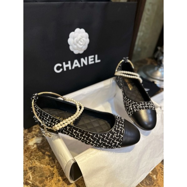 샤넬 23p 흑백 타탄 진주 메리제인 검은색과 흰색 체크무늬 천과 검은색 양가죽 앞코 원앙 진주 체인은 샤넬의 절제된 럭셔리를 잘 설명해주며 과시하지 않고 분위기를 강조함 이태리 가죽의 큰 바닥은 럭셔리를 더욱 구현함 내실 있는 신발을 만듬