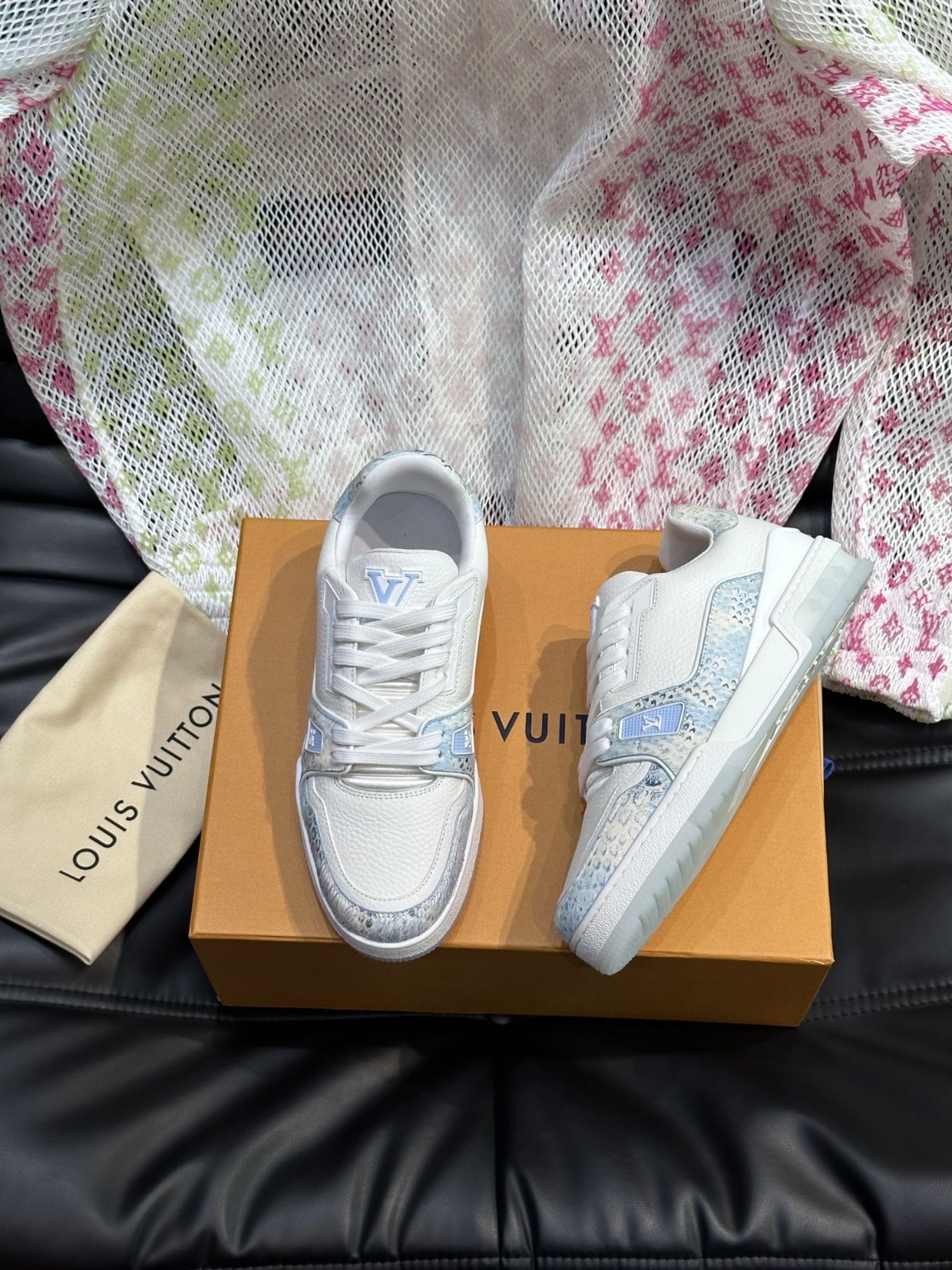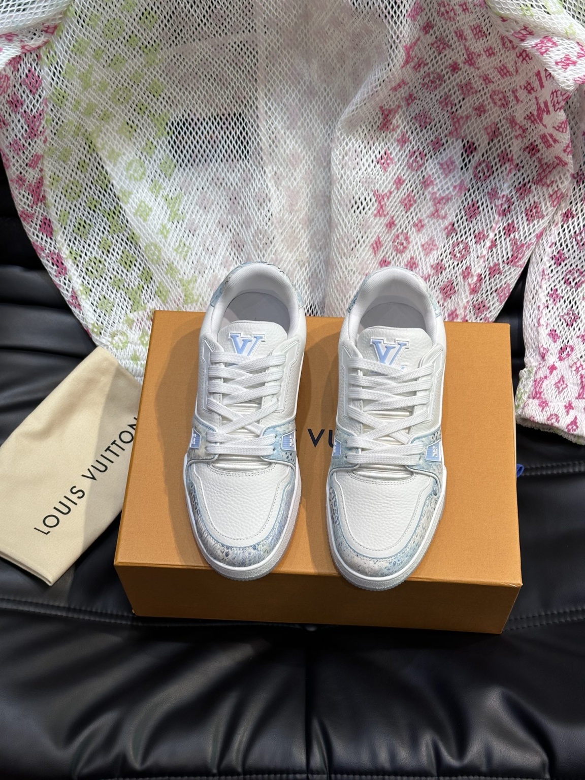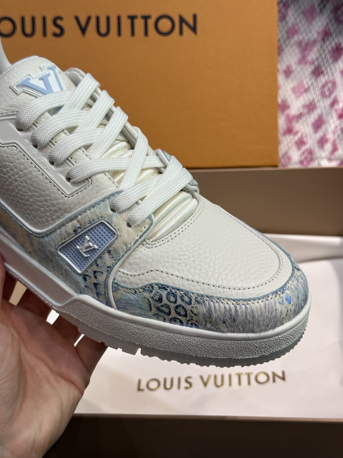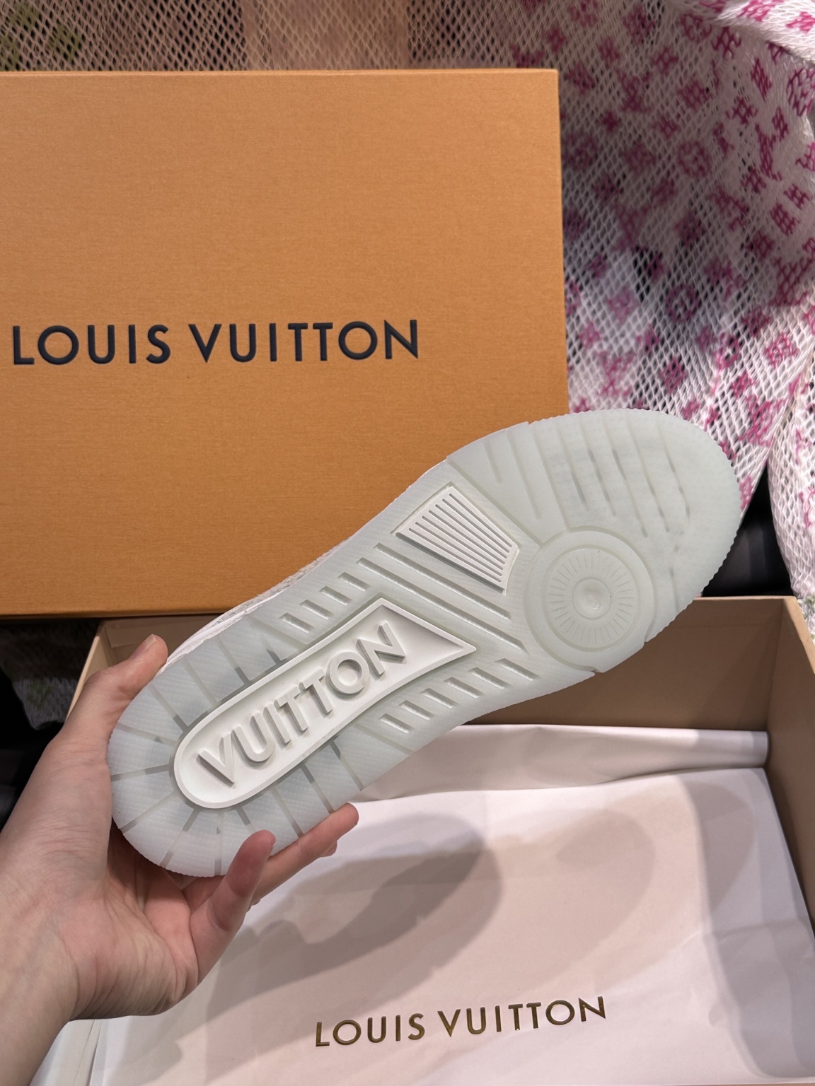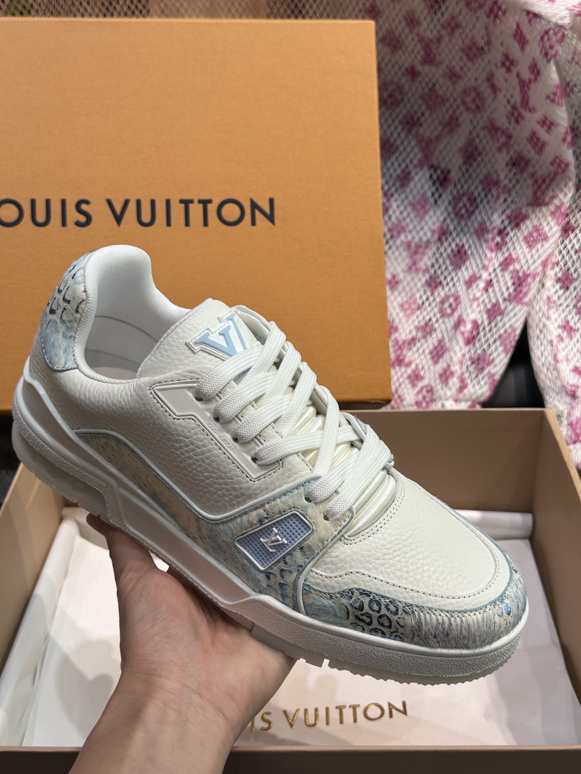 LV 럭셔리 Trainer 남성 캐주얼 스니커즈 디자이너 Virgil Abloh는 빈티지한 농구화에서 영감을 얻은 클래식한 아이디어로 부드러운 소가죽과 모노그램 엠보싱 알갱이 소가죽을 접합하고 모노그램 플로럴로 고무 밑창을 장식 테크니컬 고무 아웃솔에 혁신적인 젤 내부 패드가 장착 클래식한 농구화 스타일, 매치가 쉽고 통풍이 잘 됨