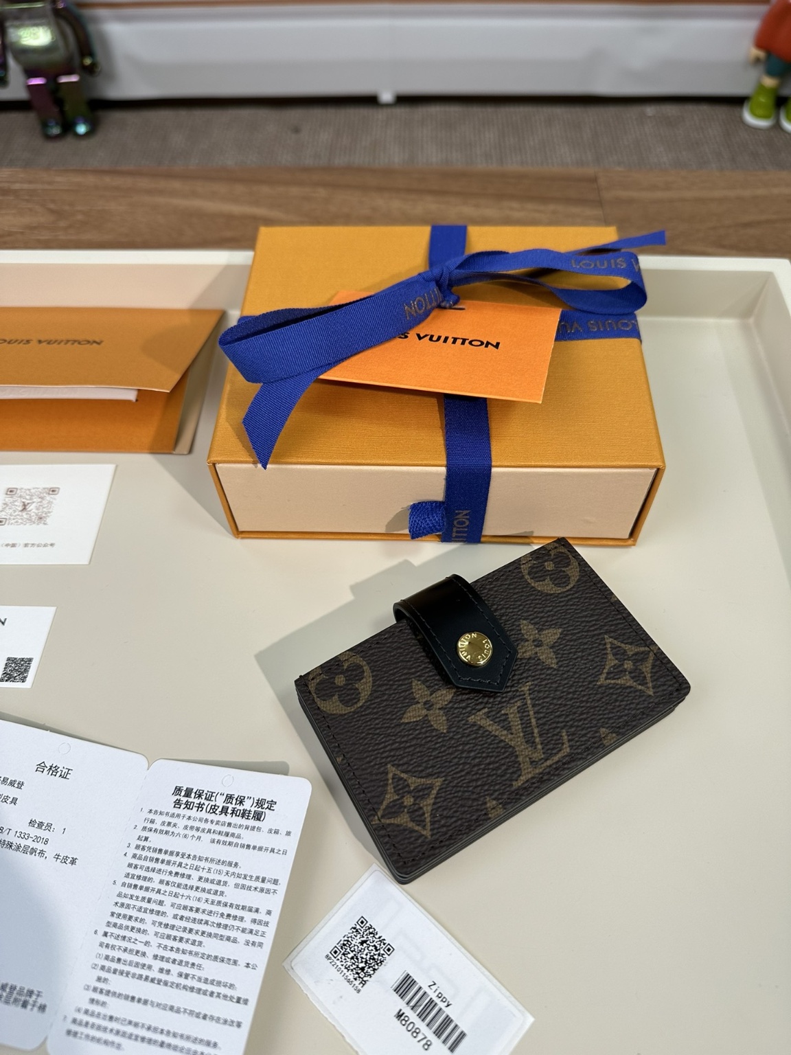 모델번호 M80878 클래식한 모노그램 캔버스와 소가죽 트리밍 루이비통 네임버클의 가죽 라벨 클로져로 정교한 구성으로 카드, 교통카드 또는 멤버십 카드 수납이 편리한 오르간 스타일 size: 10.5 x 7.5 x 1.9cm