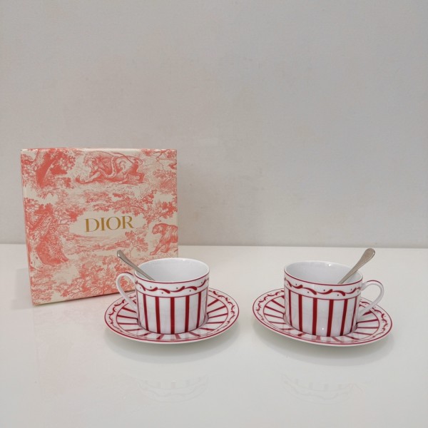 디올 Monsieur 커피잔세트 2가지 버전: 알파벳 포함/알파벳 미포함 Monsieur Dior라는 이름의 투톤 자기 디너 세트는 크리스찬 디올의 생활 예술에 대한 찬송가로 설립자 본인과 그의 친구 장 피에르 프뢰르가 1955년에 디자인한 상징적인 레드 화이트 스트라이프 컬렉션 그래픽의 절제된 고급스러움을 재현한 영원한 작품들이 코델리아 드 카스텔란(Cordelia de Castellane)이 디자인한 현대 작품들과 잘 어울림