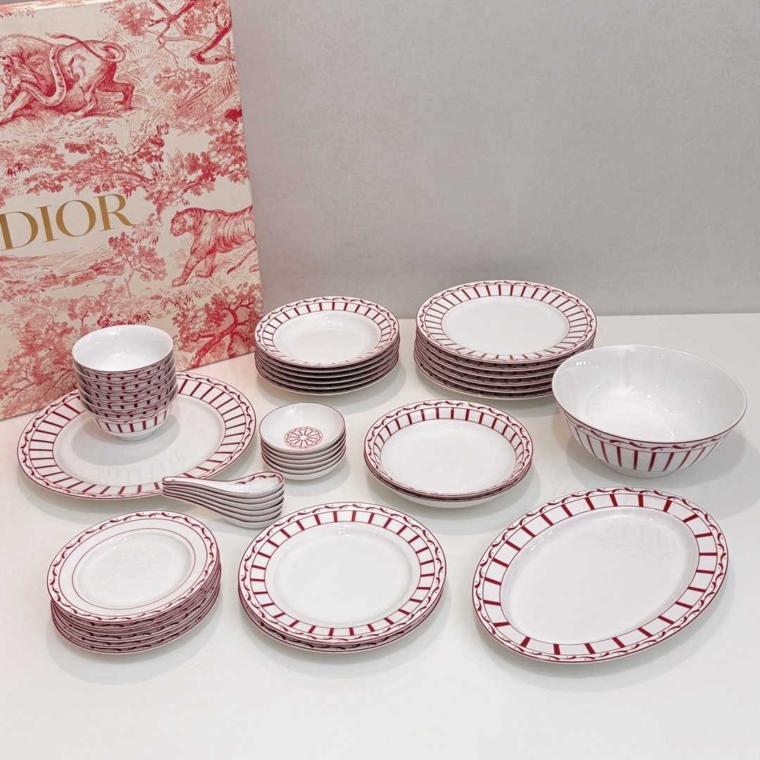 디올 Monsieur 그릇세트 43pcs 6인용 Monsieur Dior라는 이름의 투톤 자기 디너 세트는 크리스찬 디올의 생활 예술에 대한 찬송가로 설립자 본인과 그의 친구 장 피에르 프뢰르가 1955년에 디자인한 상징적인 레드 화이트 스트라이프 컬렉션 그래픽의 절제된 고급스러움을 재현한 영원한 작품들이 코델리아 드 카스텔란(Cordelia de Castellane)이 디자인한 현대 작품들과 잘 어울림 구성: 식판6+골반6+수프 플레이트6+종지6 작은술6+맛접시6+8인치 디저트 접시2+8인치 접시2 대접1+생선 접시1+12인치 대과 접시1