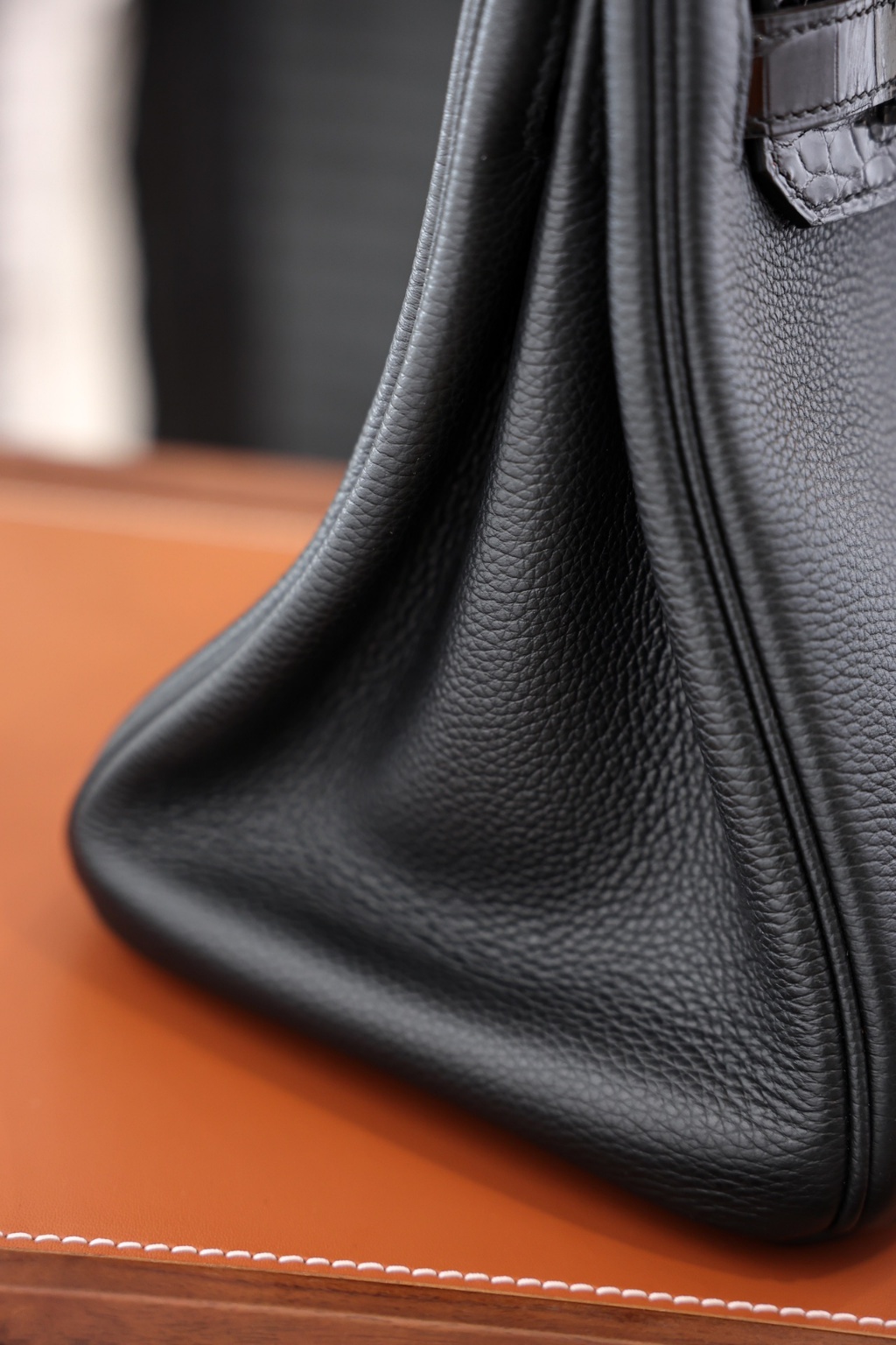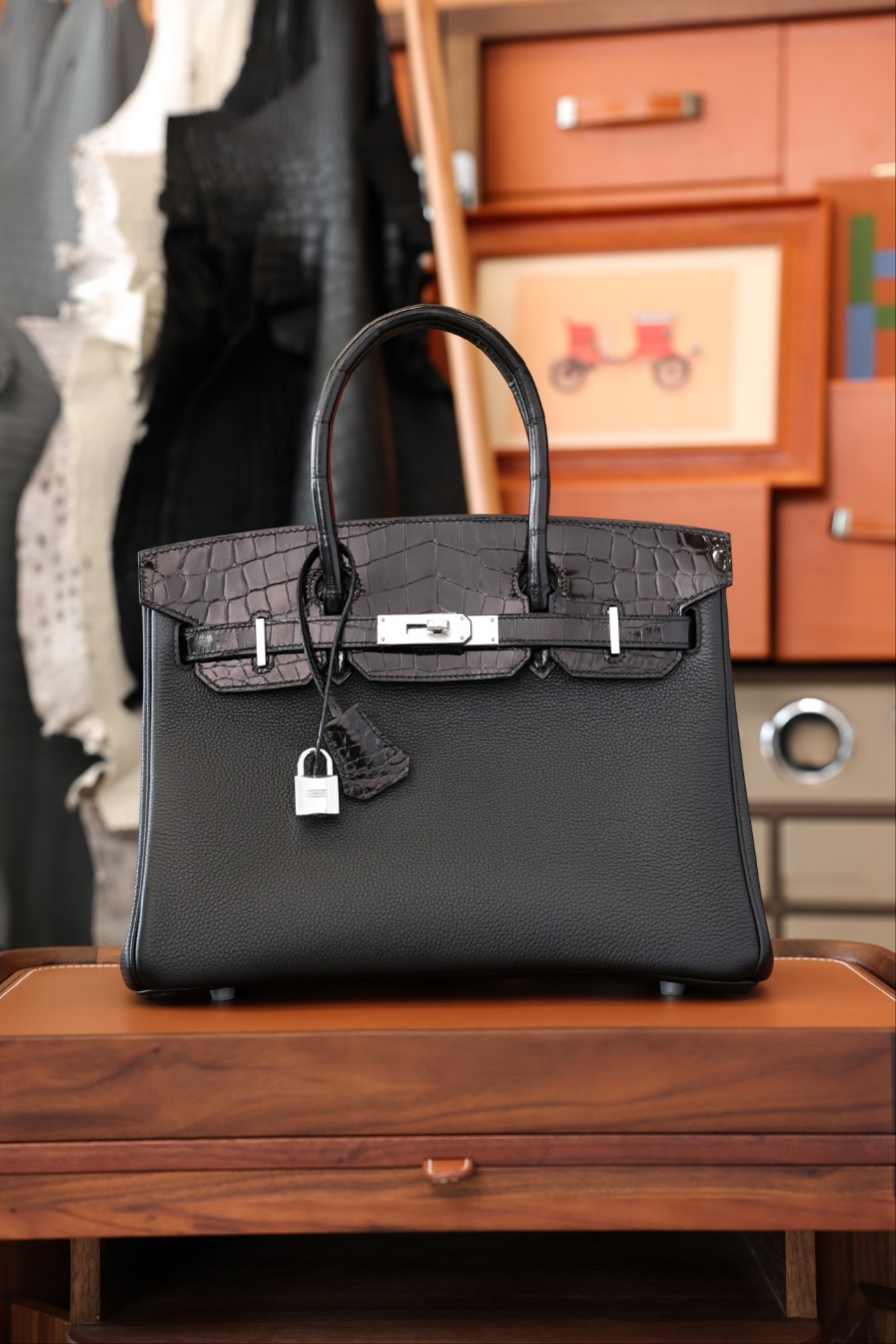Birkin 30 블랙 패치워크 터치 89 Noir Togo & Niloticus 프랑스 가죽 공방에서 고품질 원료를 선별하고 국제 협력 전문 제혁 장인과 기술팀을 보유하고 있으며 원자재 조달에서 생산 공정에 이르기까지 모든 세부 사항을 책임지고 제작함 이것은 아무 제조업체나 할 수 있는 것이 아님 매우 단단한 자원 공급망과 업계의 침전이 있어야 지탱가능