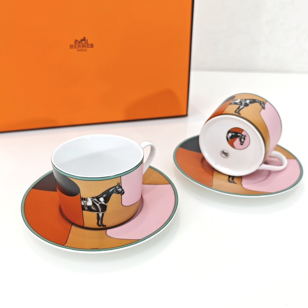 에르메스 커피잔 2컵+2접시 피에르 샤르핀(Pierre Charpin)에 의해 만들어진 라 세르펜타인 헤르메스(La Serpentine Her*mes) 에밀 헤르메스 컬렉션의 카탈로그에서 영감을 받았음 새틴을 주축으로 날렵한 곡선과 컬러를 표현한 디자인 재미있는 숨바꼭질이 시작되어 준마가 다시 화려하게 등장함 백태 45% 고골자기, 1350도 고온 소성 1:1 맞춤 제작, 선물세트 포장