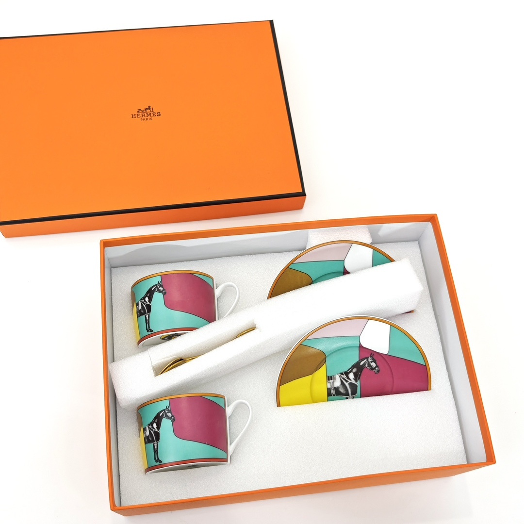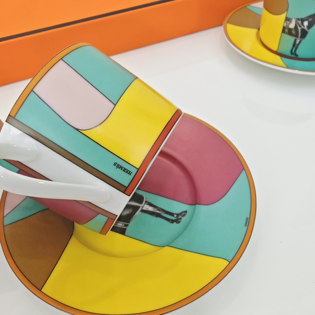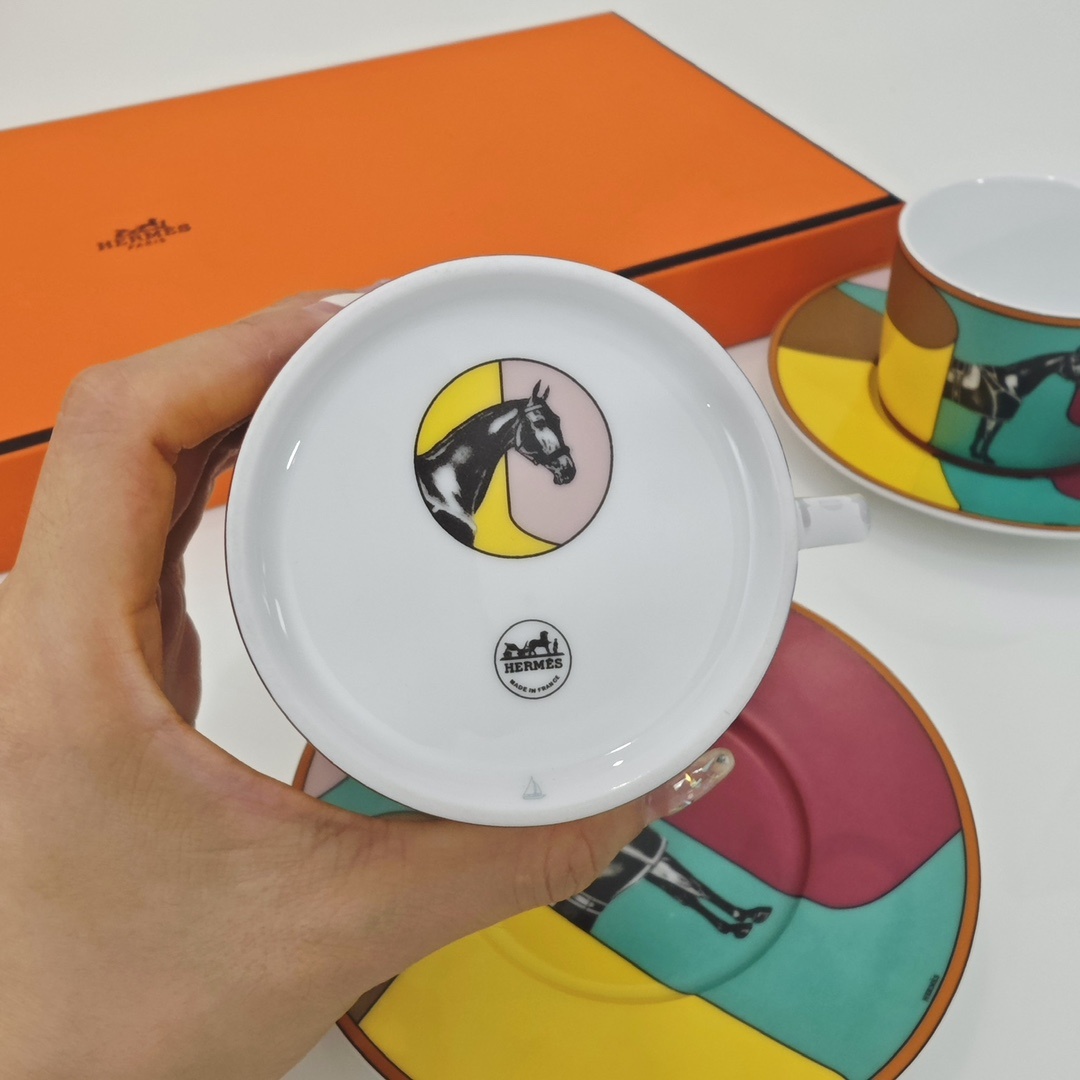 에르메스 커피잔 2컵+2접시 피에르 샤르핀(Pierre Charpin)에 의해 만들어진 라 세르펜타인 헤르메스(La Serpentine Her*mes) 에밀 헤르메스 컬렉션의 카탈로그에서 영감을 받았음 새틴을 주축으로 날렵한 곡선과 컬러를 표현한 디자인 재미있는 숨바꼭질이 시작되어 준마가 다시 화려하게 등장함 백태 45% 고골자기, 1350도 고온 소성 1:1 맞춤 제작, 선물세트 포장