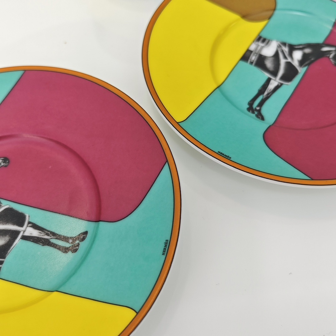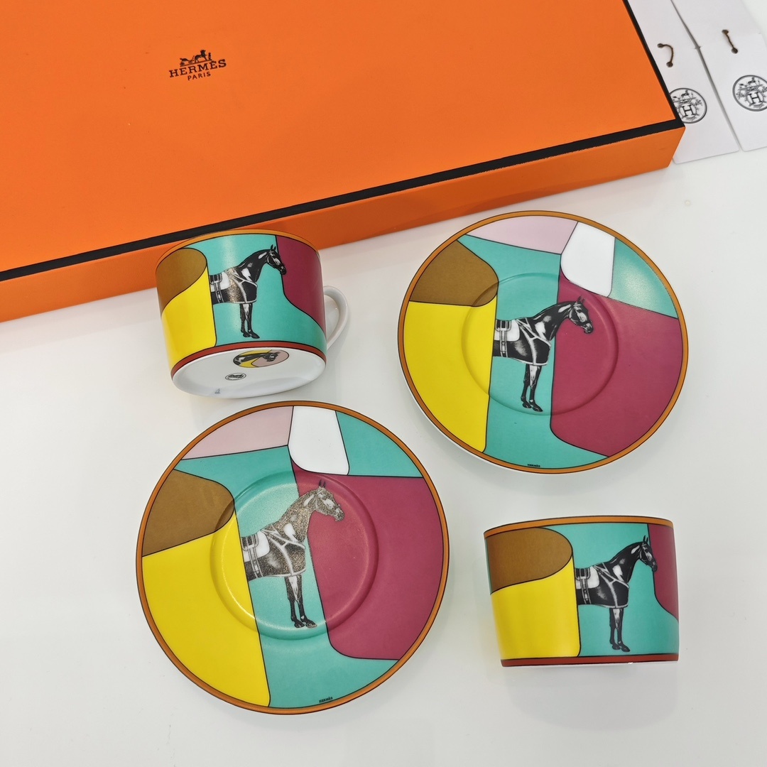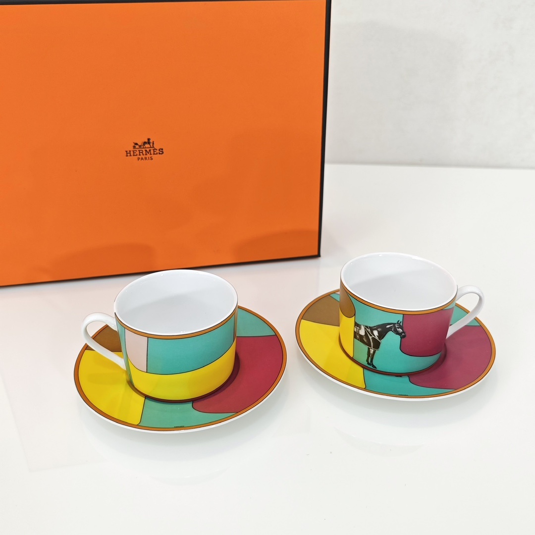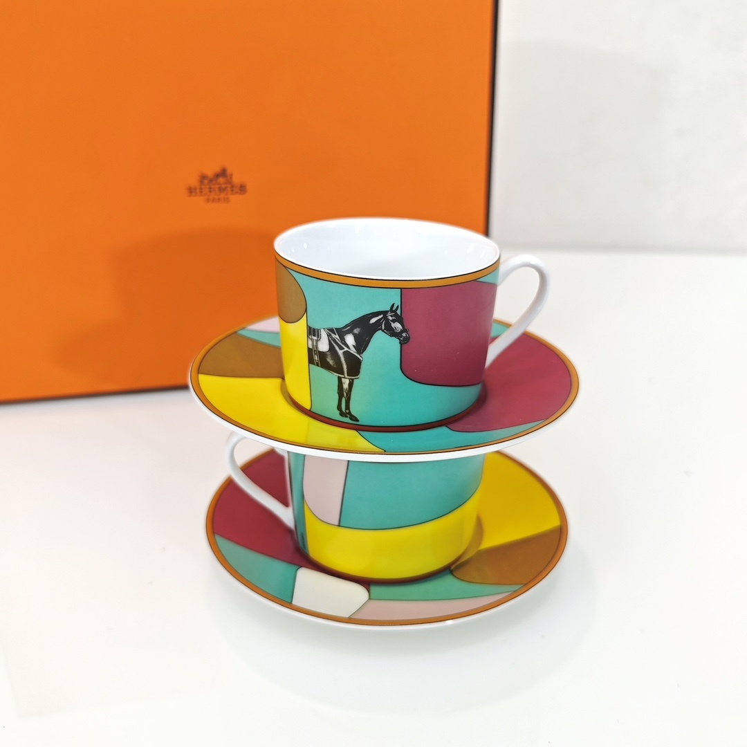 에르메스 커피잔 2컵+2접시 피에르 샤르핀(Pierre Charpin)에 의해 만들어진 라 세르펜타인 헤르메스(La Serpentine Her*mes) 에밀 헤르메스 컬렉션의 카탈로그에서 영감을 받았음 새틴을 주축으로 날렵한 곡선과 컬러를 표현한 디자인 재미있는 숨바꼭질이 시작되어 준마가 다시 화려하게 등장함 백태 45% 고골자기, 1350도 고온 소성 1:1 맞춤 제작, 선물세트 포장