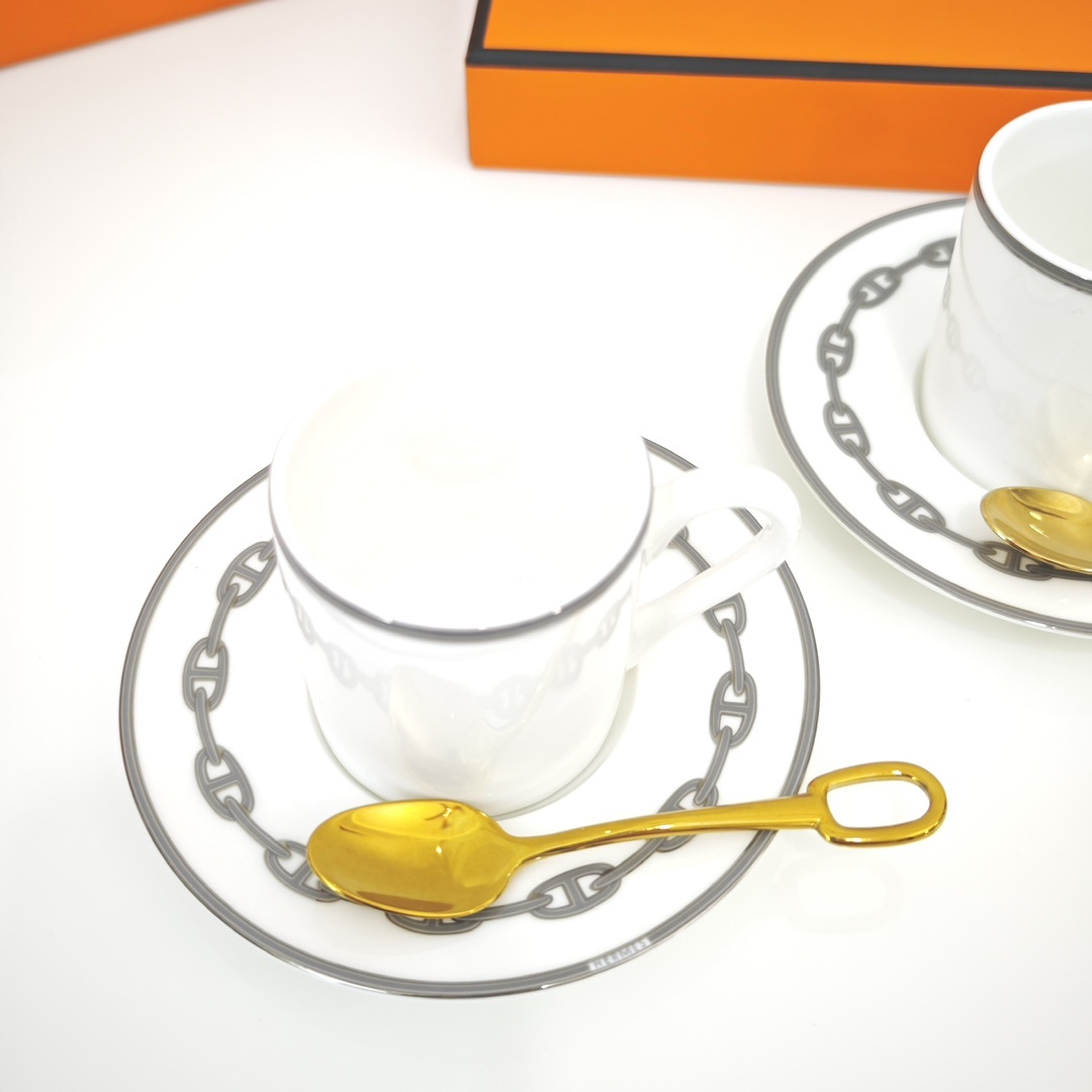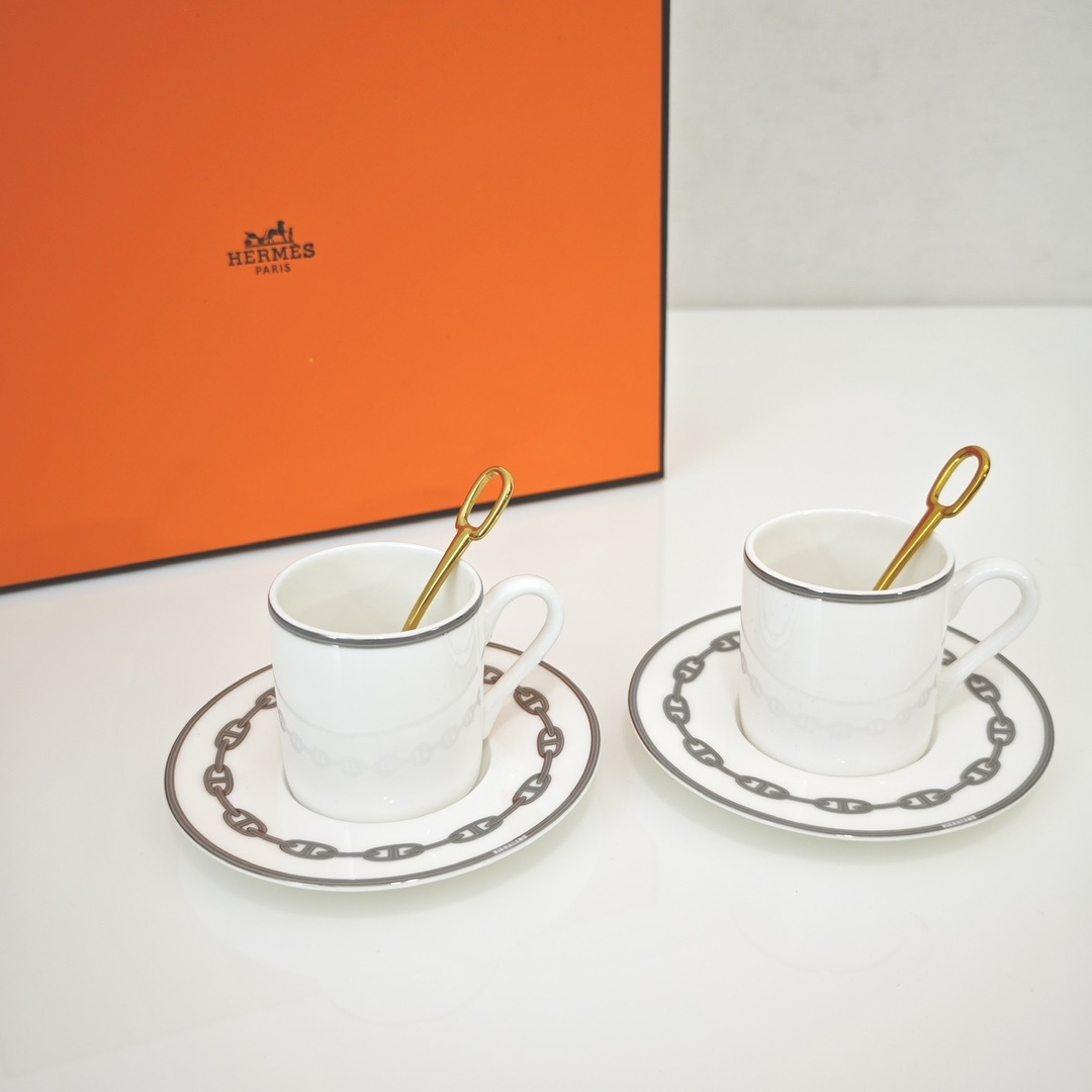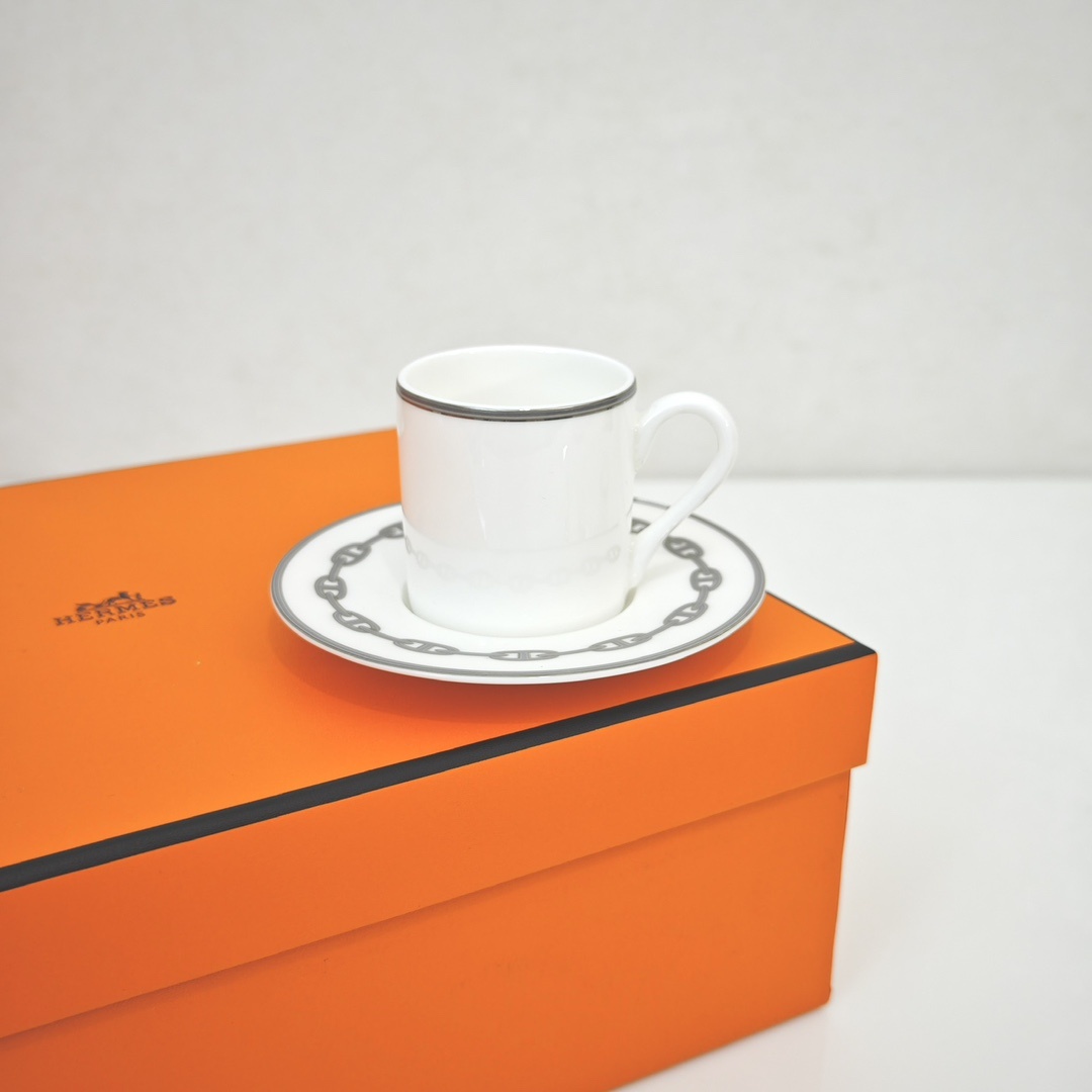 Hermes - Chaine dAncre Platinum/샹달 플래티넘 라인 [에스프레소 커피잔 세트]2컵 2접시 스푼별도(골드/실버) 실크스크린 프린팅과 핸드페인팅으로 장식 플래티넘 소재 장식 Chaine dAncre 세트 디자인은 아이코닉한 에르메스 체인링에서 영감을 받아 클래식하고 심플함 식기세척기 X, 전자레인지 X