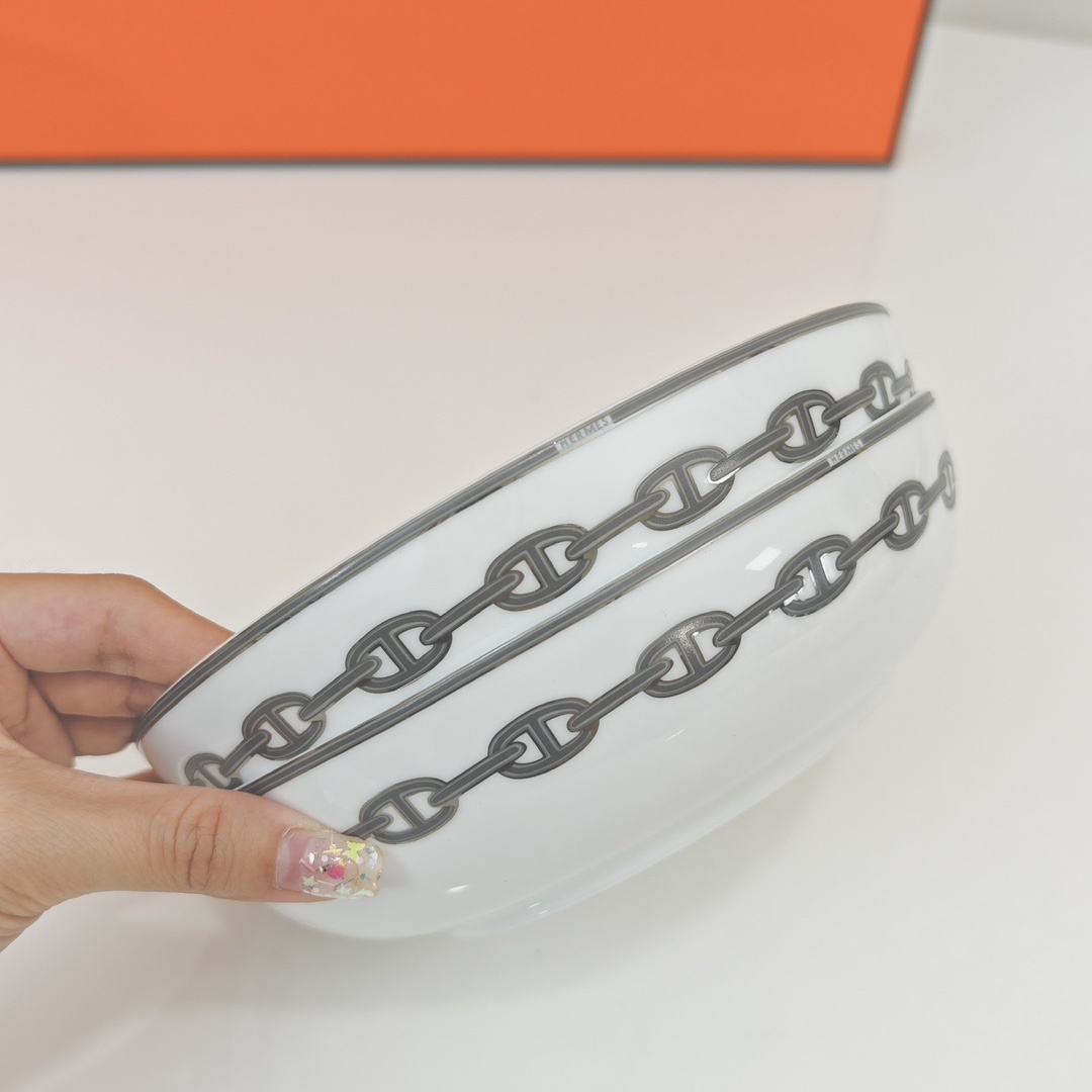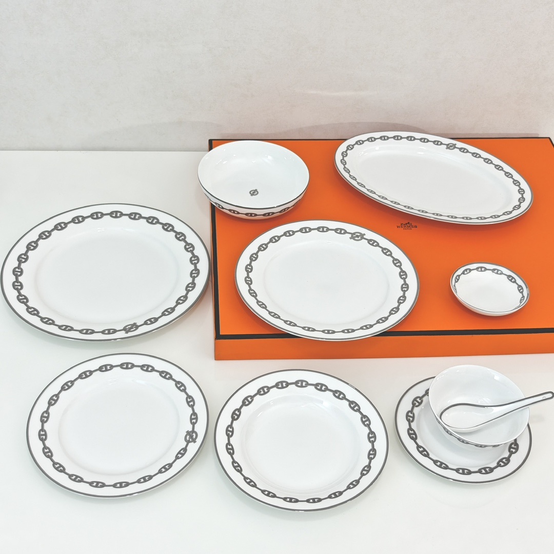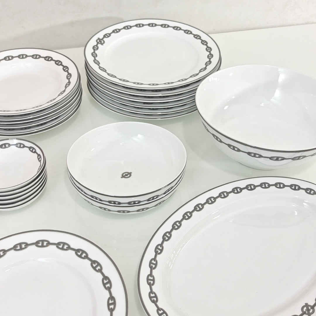 Hermes - Chaine dAncre Platinum/샹달 플래티넘 라인 중/양식 6인 43피스 식기 실크스크린 프린팅과 핸드페인팅으로 장식 플래티넘 소재 장식 Chaine dAncre 세트 디자인은 아이코닉한 에르메스 체인링에서 영감을 받아 클래식하고 심플함 식기세척기 X, 전자레인지 X 10인치 식판6, 6인치 골반6, 9인치 수프 플레이트6 종지6, 작은술6, 맛접시6, 딤섬접시2 곡물그릇2, 대접1, 어판1, 12인치 대과반1