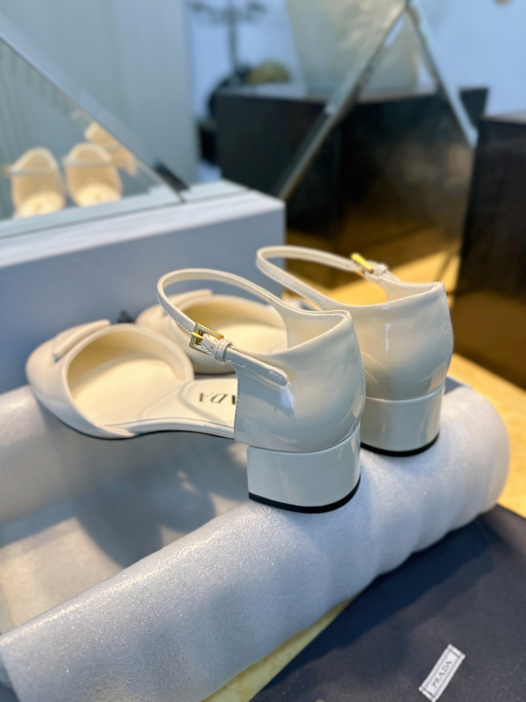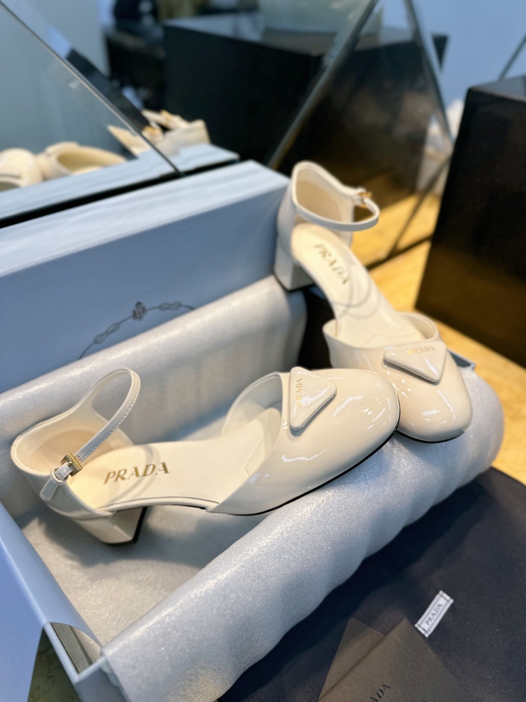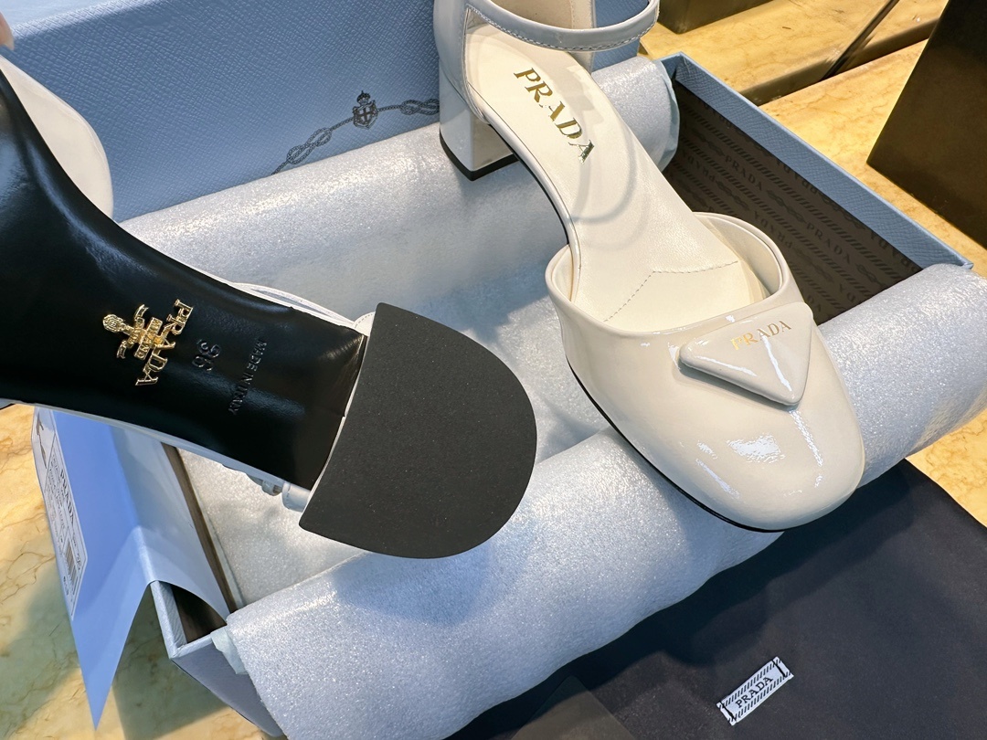 프라다 에나멜 메리제인 시그니처 삼각 로고가 포인트 아이템 신발 끈 조절이 가능한 골드 버클로 누드 포인트 3.5cm 스퀘어 굽이 가장 적당한 높이 밑창까지 정교한 브랜드 로고 금속 장식