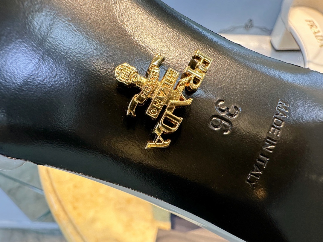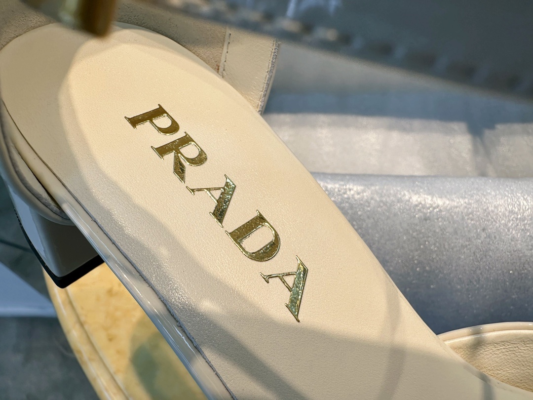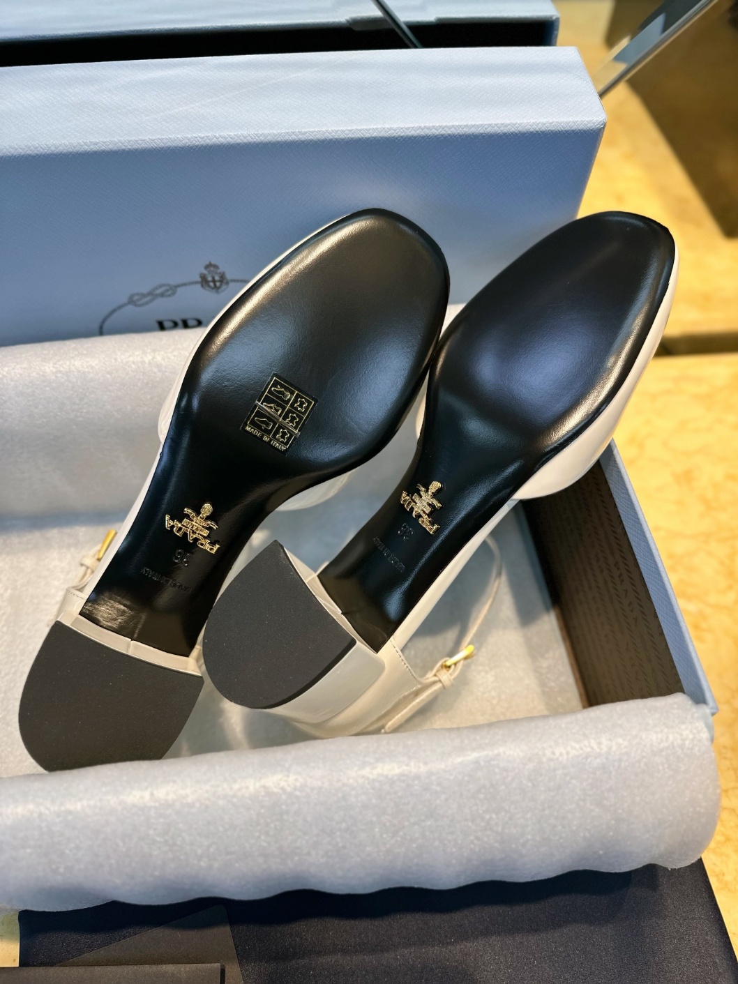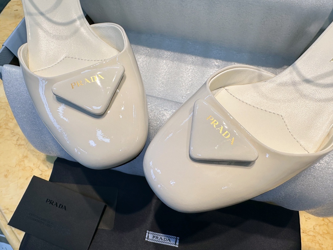 프라다 에나멜 메리제인 시그니처 삼각 로고가 포인트 아이템 신발 끈 조절이 가능한 골드 버클로 누드 포인트 3.5cm 스퀘어 굽이 가장 적당한 높이 밑창까지 정교한 브랜드 로고 금속 장식