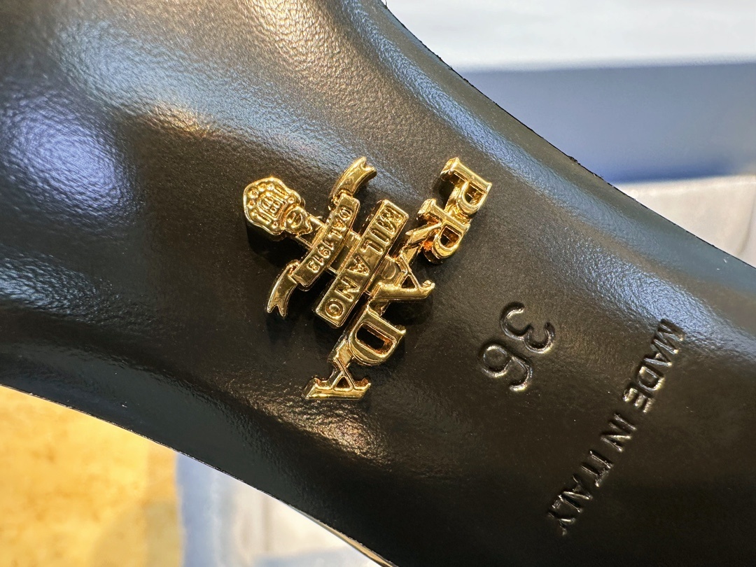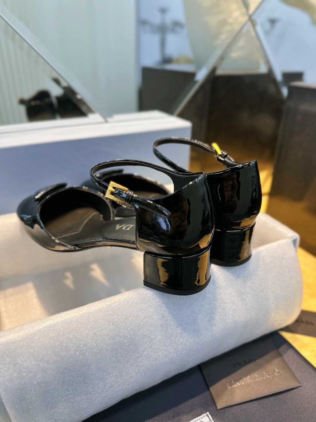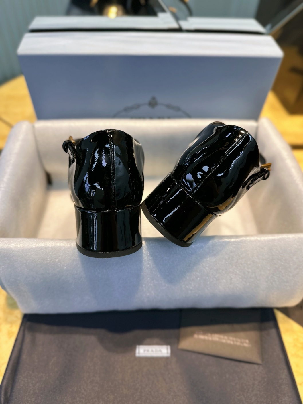 프라다 에나멜 메리제인 삼각형 로고+일자벨트 디자인으로 매치 송아지 에나멜 구두+양가죽 깔창 3.5cm 스퀘어 굽이 가장 적당한 높이 밑창까지 정교한 브랜드 로고 금속 장식