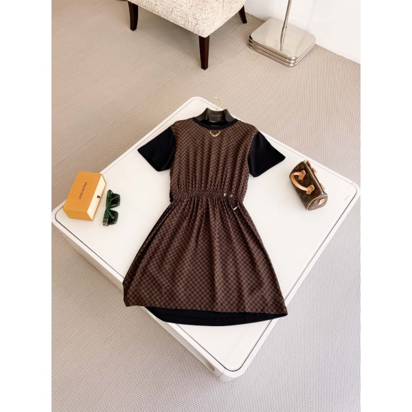 LOUIS VUITTON 24 여름 노화 바둑판 니트 배색 실크 원피스 편안한 양면 니트 원피스로 제작된 캐주얼한 원피스 정면에 미니 전폭 모노그램 데미어 패턴과 허리 스트링 조임 스타일리시한 LV 체인 네크라인으로 세련미를 더했으며 최고 퀄리티로 발매
