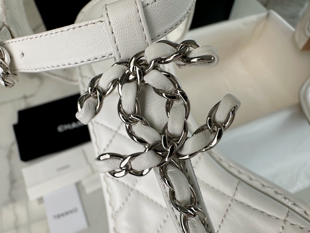 샤넬 24C 화이트 조리 통굽샌들 맑고 깨끗한 색상은 천사처럼 화이트 스몰무스탕+이태리 리얼 가죽 통굽 메탈 체인과 매치하여 가죽이 럭셔리하고 질감있게 퀼팅 공예 장인의 핸드메이드