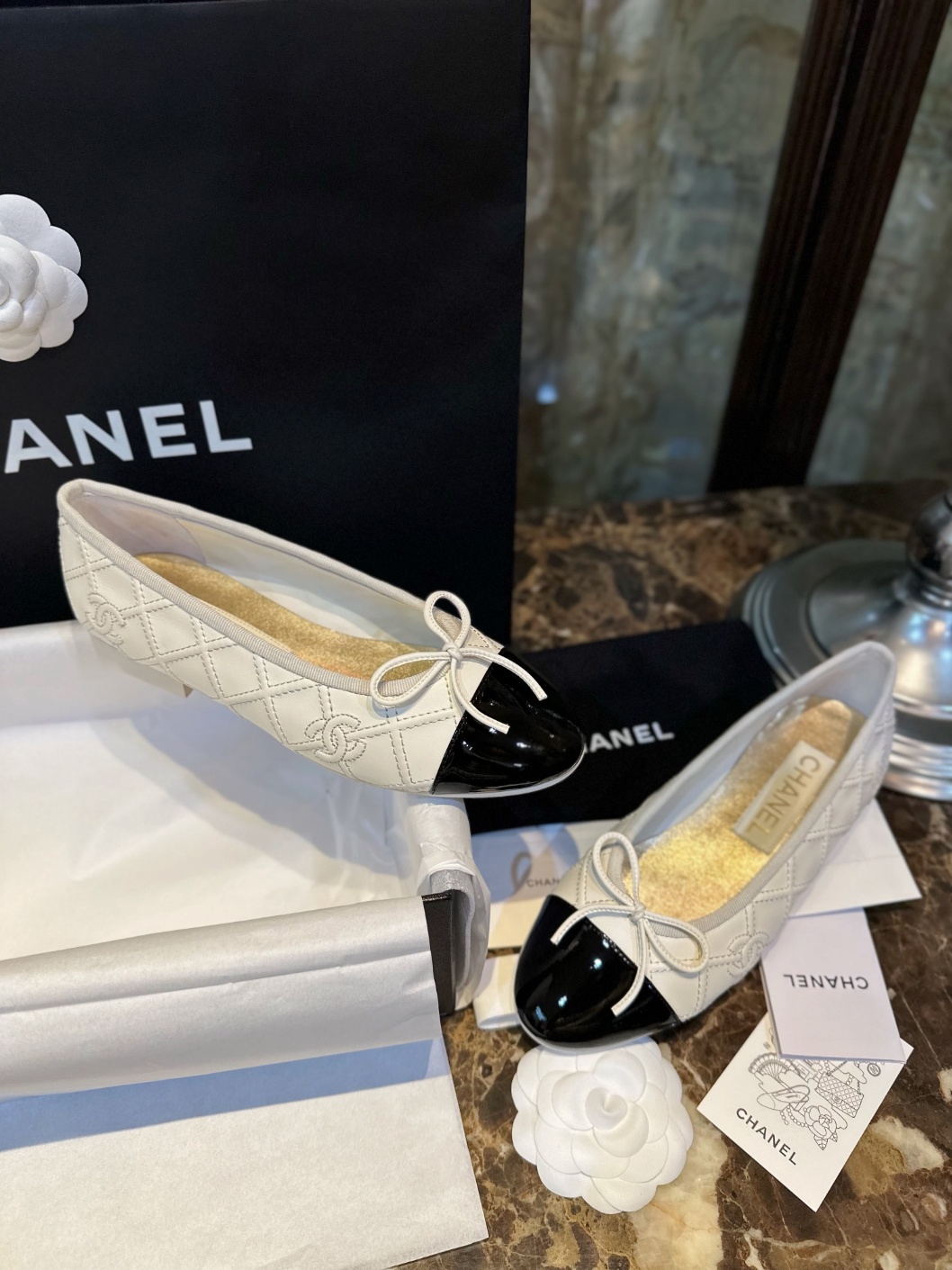 샤넬 23S 입체자수 화이트 발레슈즈 수입 친환경 양가죽 입체 퀼팅 로고 자수 짜임새는 힘들지만 한 달 넘게 그 과정을 거쳐서 제작 베이지 전체 퀼팅에 블랙펄 에나멜 가죽을 매치하여 특히 고급스럽고 멋스러움, 놓치지 마세요