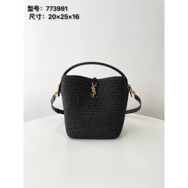 생로랑 LE 37 위빙 라피아 버킷백 ysl 2024 라피아와 베지터블 가죽 패치 LE CASSANDRE 버클 여밈, 탈부착 가능한 어깨끈 여름 바캉스 여행 필수, 패션 아이템 모델번호: 773991 사이즈: 20x25x16cm