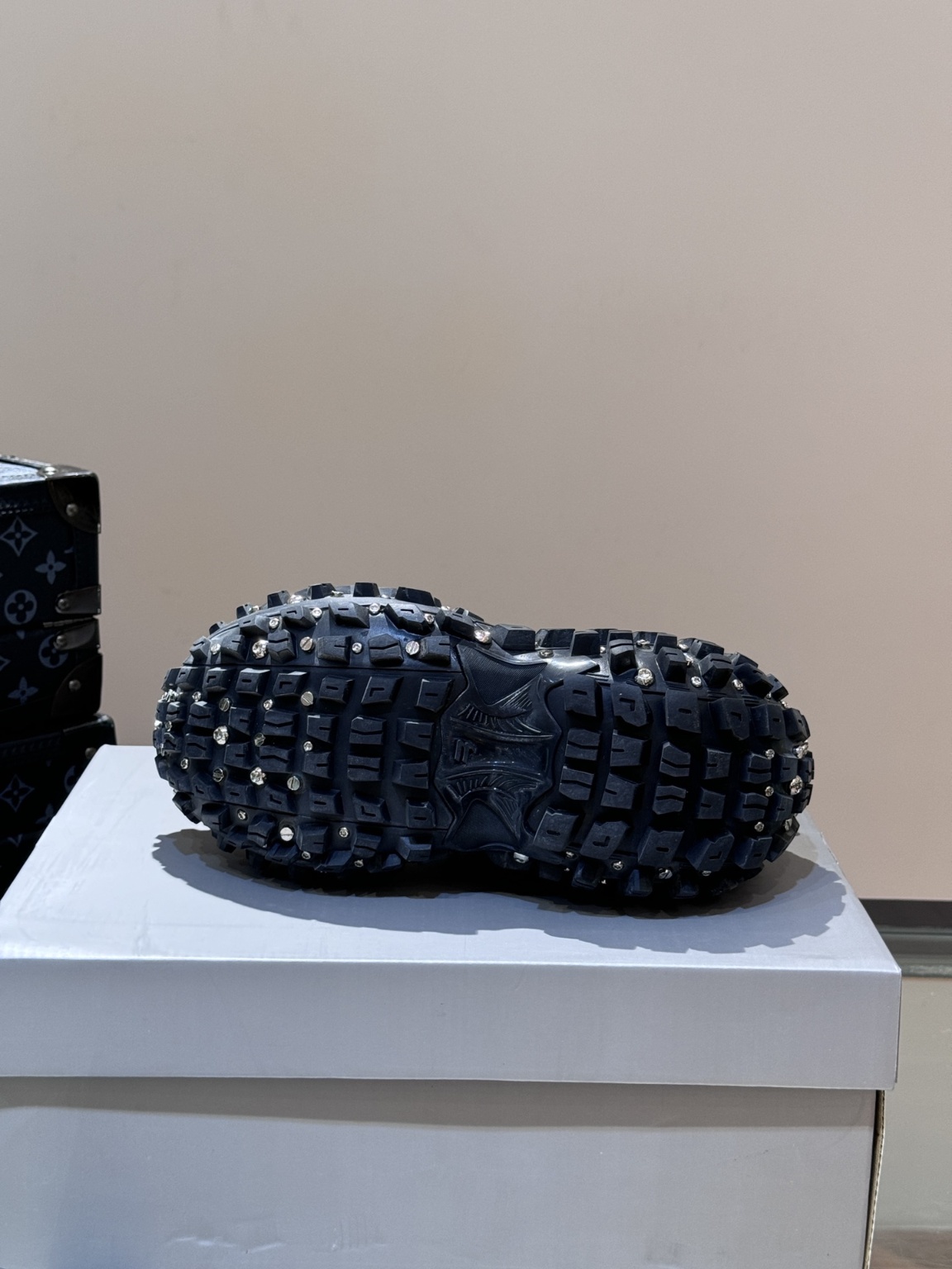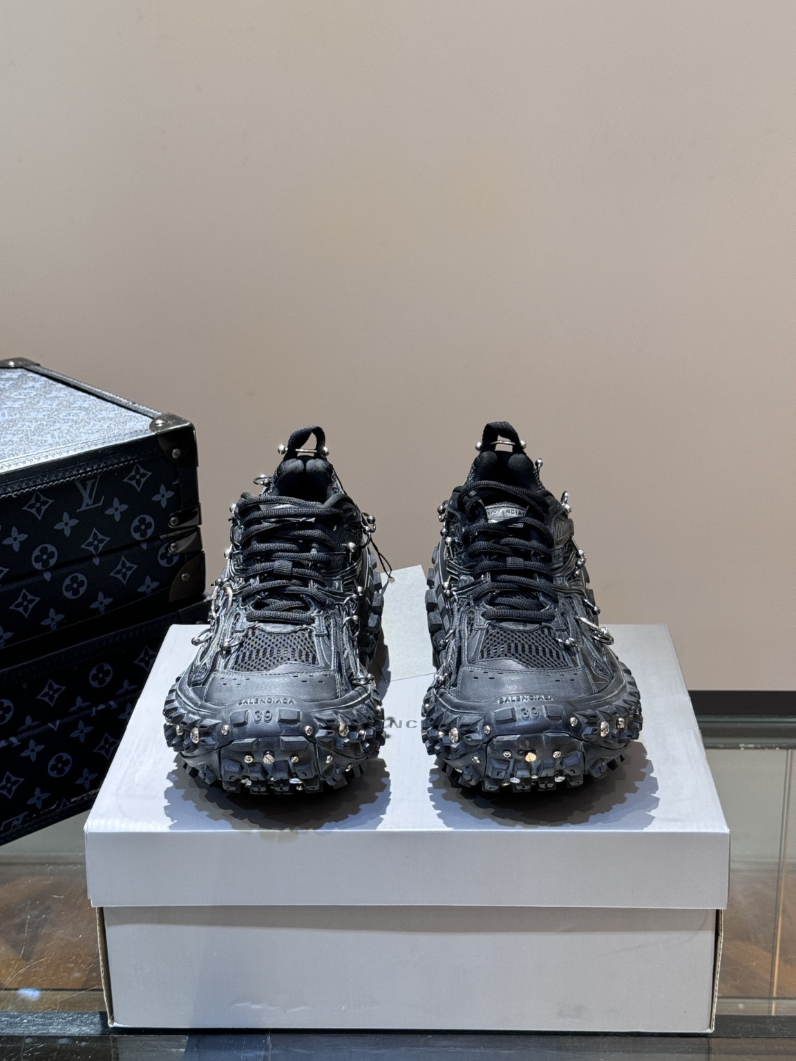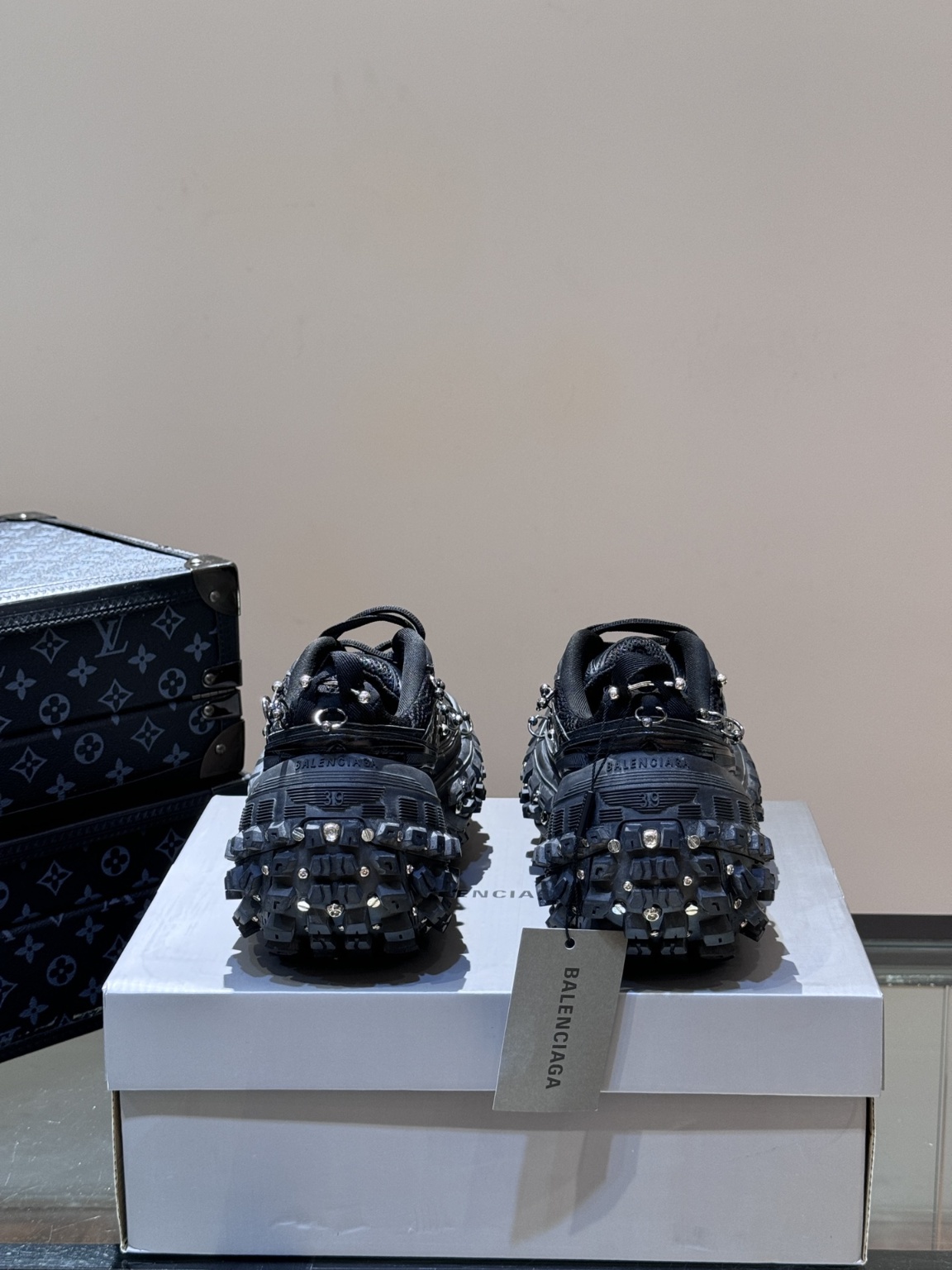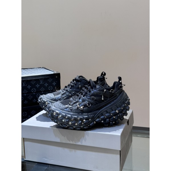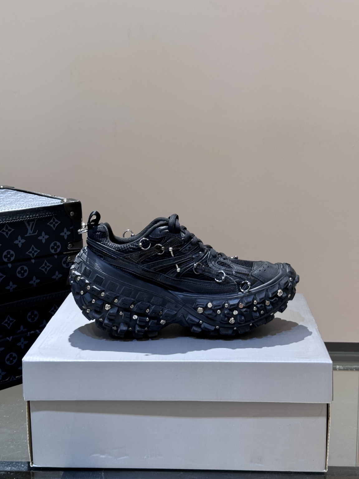 발렌시아가 디펜더 커플 메쉬 통굽 스니커즈 탱크 크롤러 타이어 징 장식, 아웃도어 키높이 캐주얼 조깅화 1:1 비율의 무게, 신발 표면에 쇠고리와 스터드 장식 손바닥 전체 PU 라텍스 인솔 및 외관 경미한 마모 구제 효과 4단 콤비네이션 타이어 패턴으로 스파이크 아웃솔을 포인트