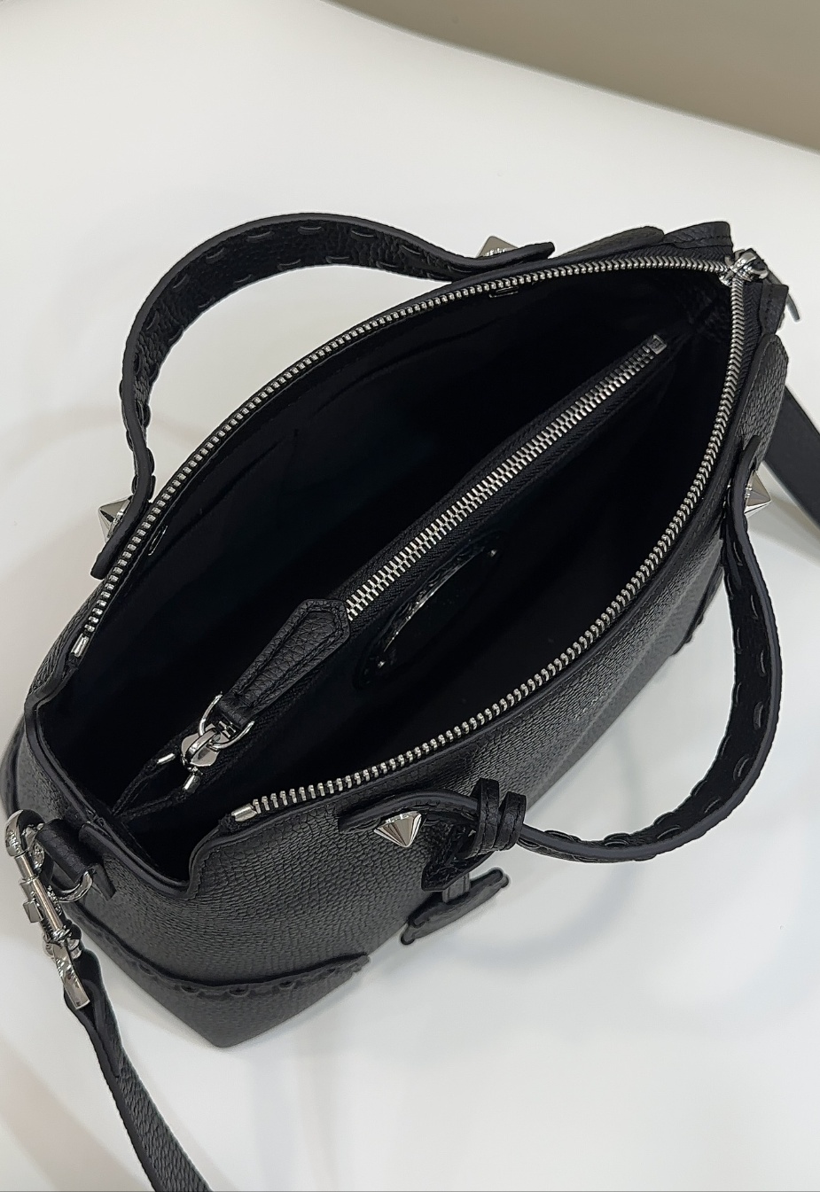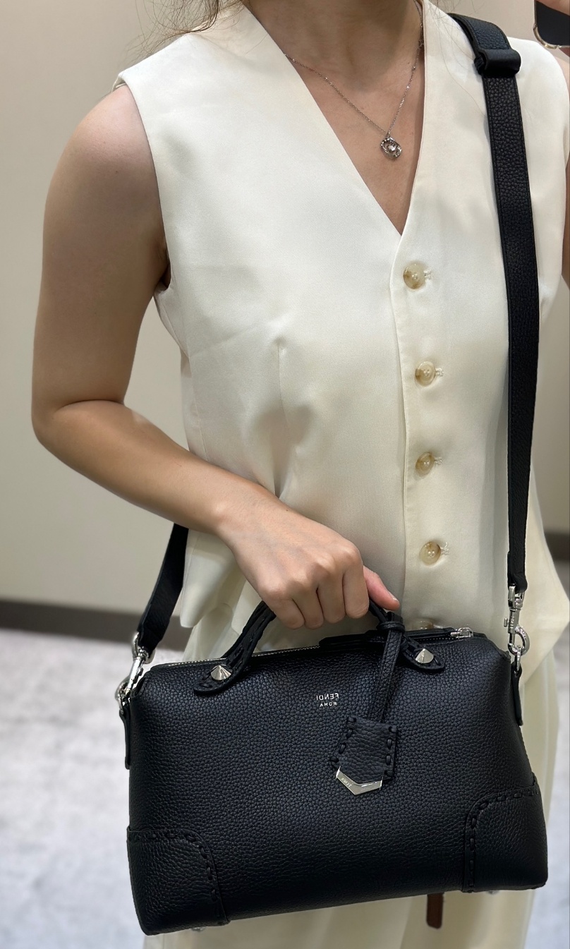 펜디의 부드러운 송아지 가죽 바이더웨이 미디엄 디 그라데이의 대비되는 핸드페인팅 골지 수입 소가죽을 핸드메이드로 봉제하여 투핸드 그립으로 조절 가능, 탈부착 가능한 숄더 스트랩 Size: 27x13x15cm