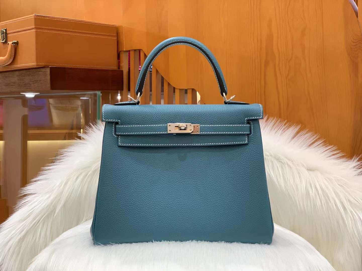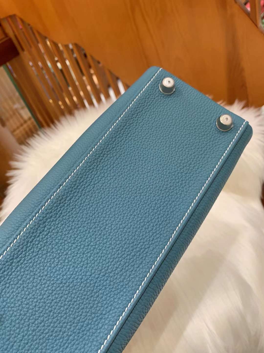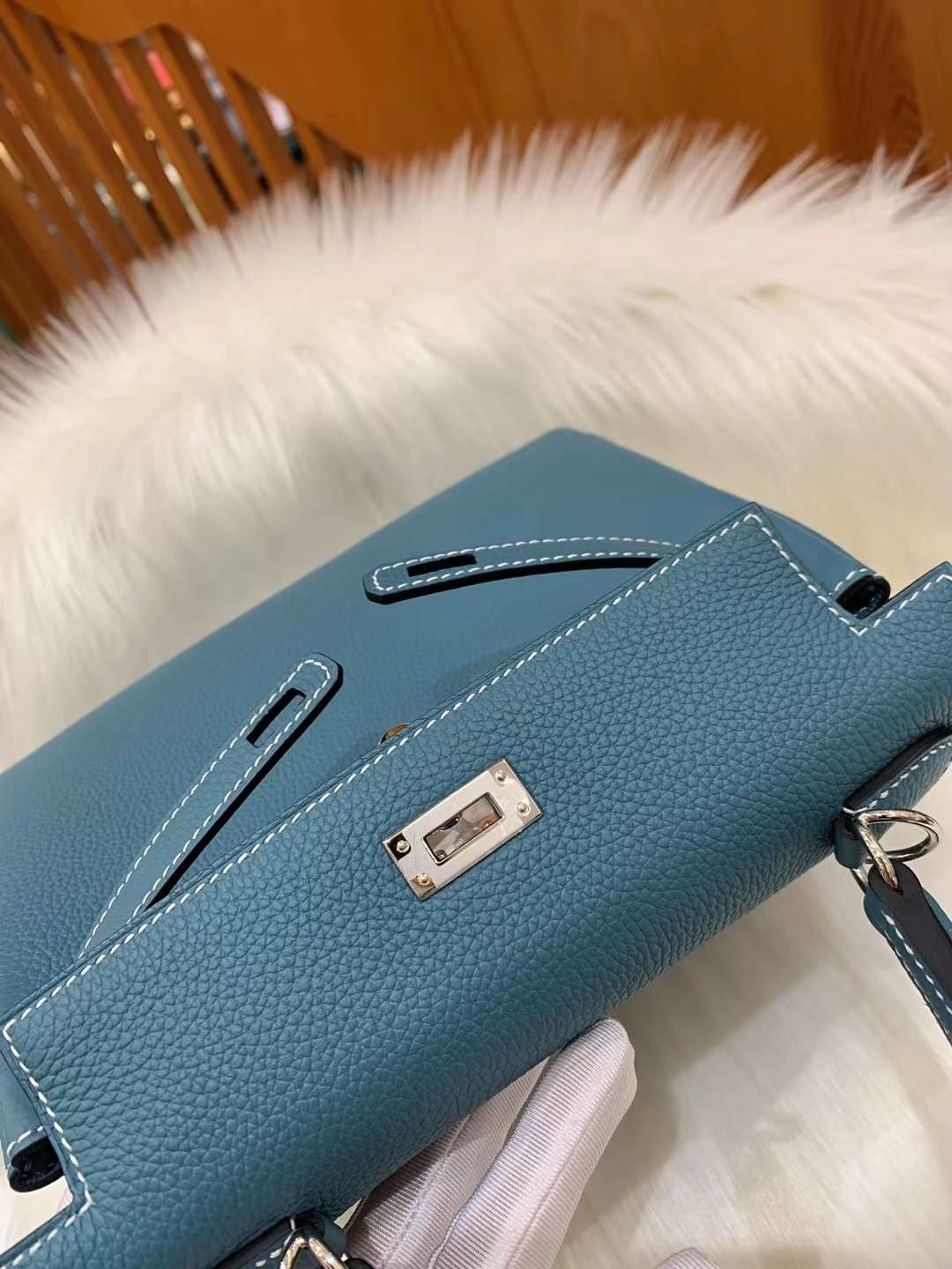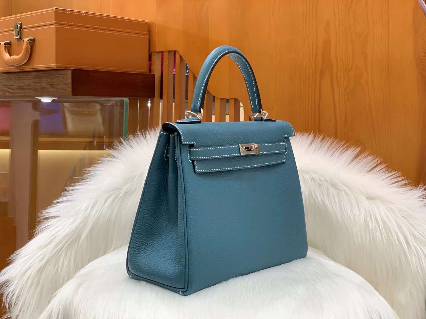 Kelly 25cm 인디고블루 토고 소가죽 실버 버클 오리지널 밀랍 실, 최고급 핸드 스티치