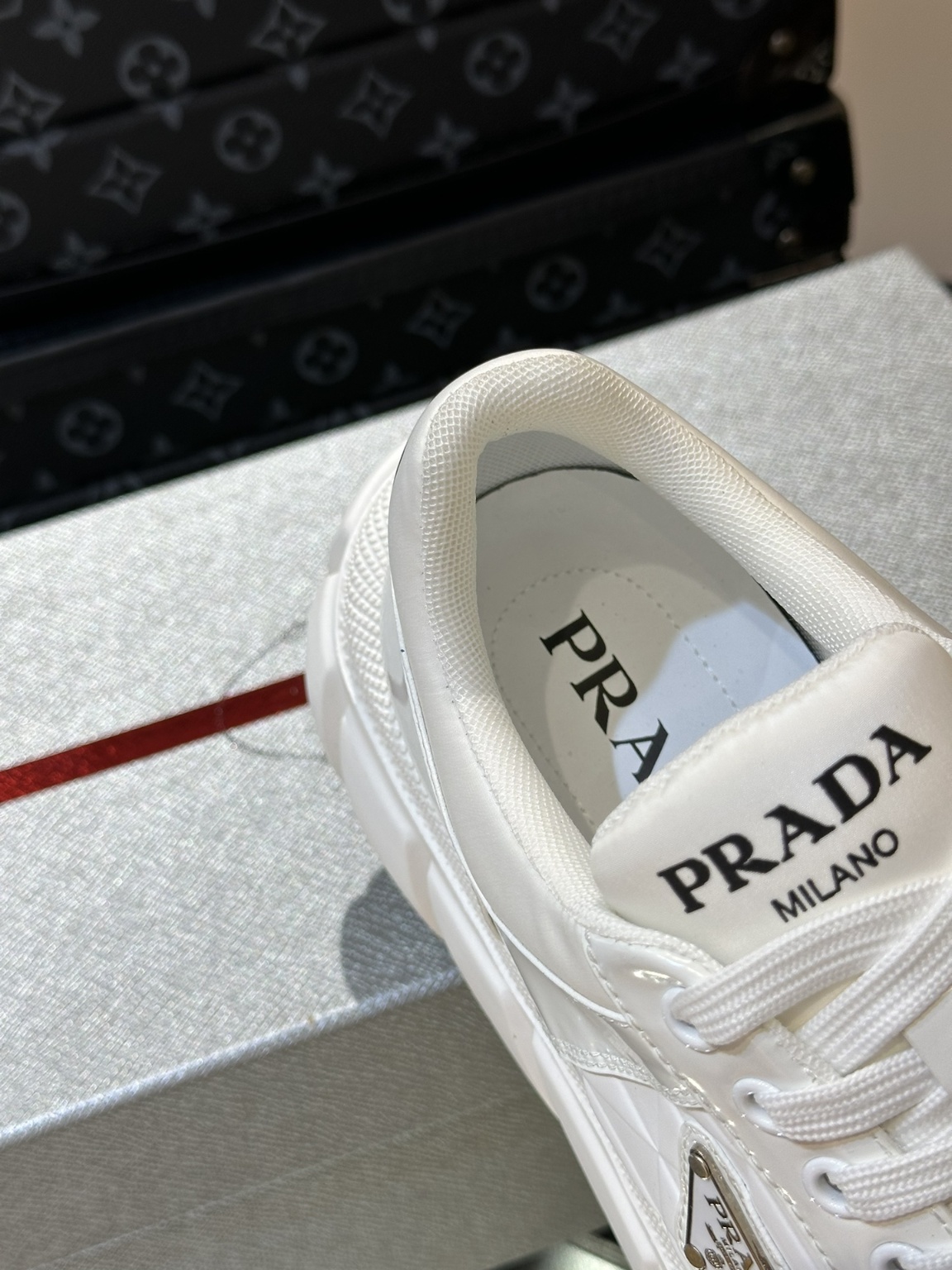 프라다 2024 봄여름 신상품 남성 프리미엄 운동화 소가죽 패치워크의 헤드라이닝으로 가볍고 발포성이 높아 발이 매우 편안하며 부드럽고 간결한 선으로 스포티한 분위기를 연출함 바닥은 안정적이며, 시그니처 에나멜 코팅 삼각형 금속로고 혀에는 엠보싱 효과의 실크스크린 프린팅 로고가 장식