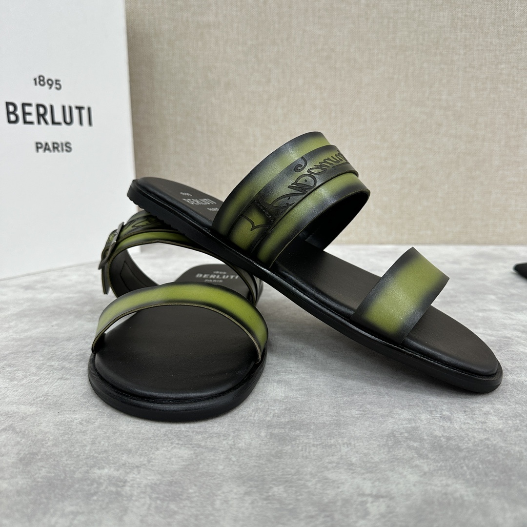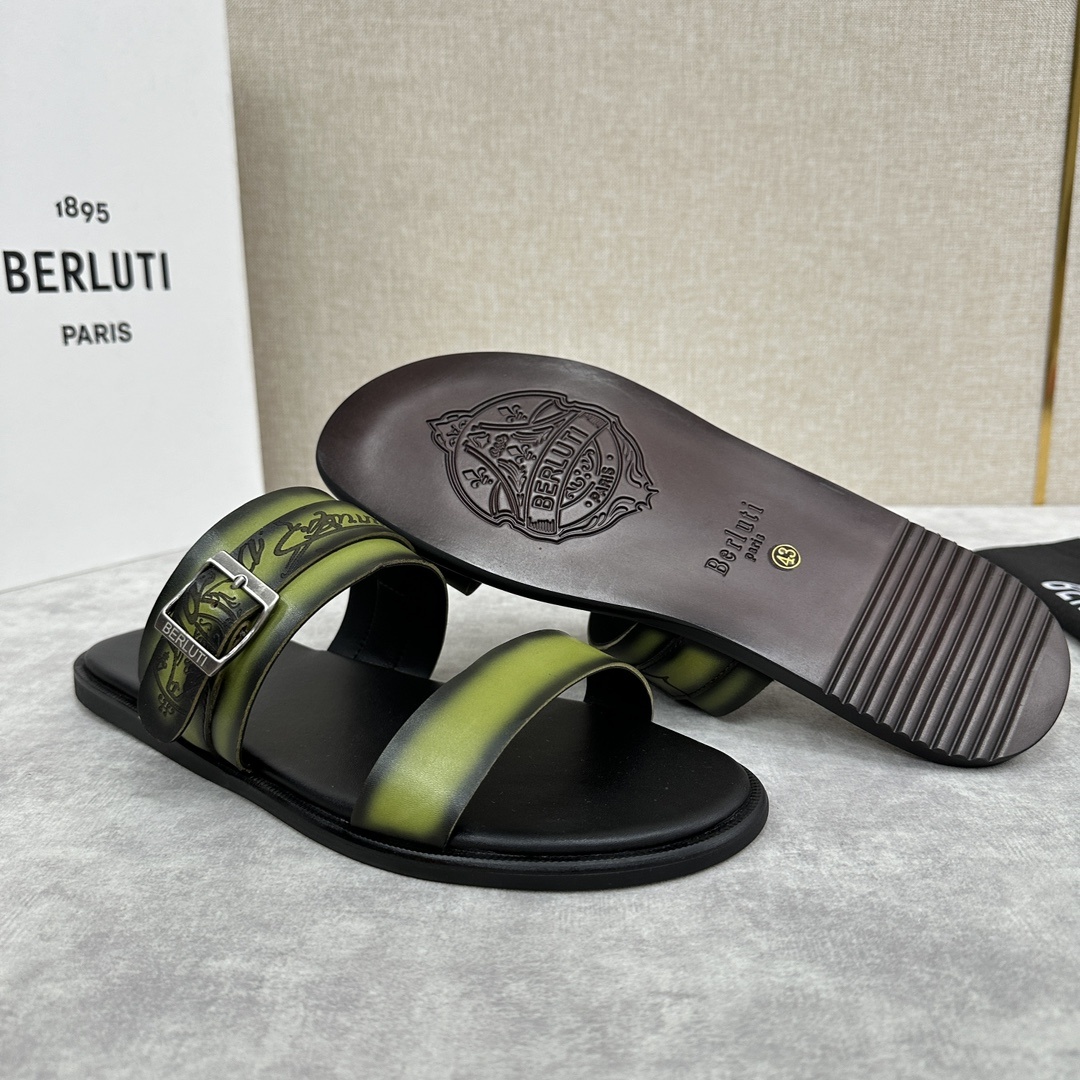 Berluti 시프노스 스크리토 레더 슬리퍼 샌들 S/S 컬렉션 이탈리아산 EGIO 골 응집 공정과 아이디어 수입 엠보 소가죽 핸드페인팅으로 Patina 옛 염색 기법 염색사의 손길이 연출하는 컬러 변화의 무한한 가능성 나만의 신발 밑창, 악어 무늬 엠보싱 부분 스크리토 무늬의 새틴 조각 Vitello Scrito 무늬와 Plain Venezia의 레이스 처리된 고무 밑창 Scrito 무늬 조각 문양 뱃지의 럭셔리한 질감이 극대화됨