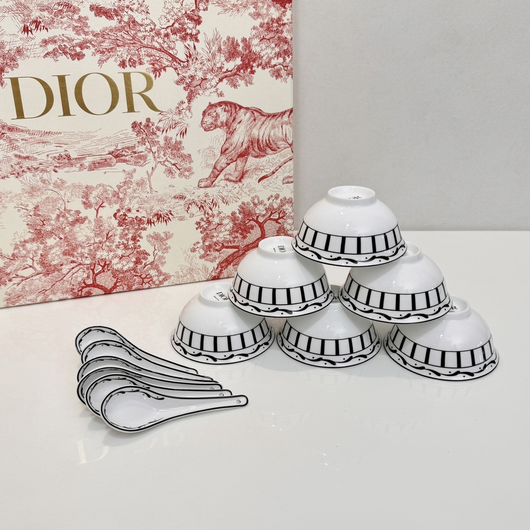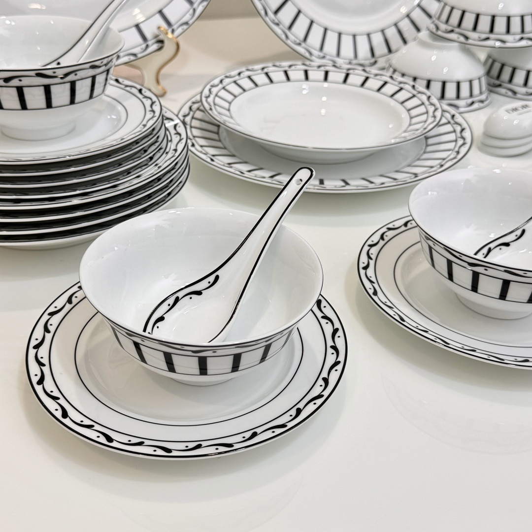 무슈 디올 43피스 6인세트 Monsieur Dior라는 이름의 투톤 자기 디너 세트 크리스찬 디올의 생활 예술에 대한 찬송가로 창립자 본인과 그의 친구 장 피에르 프레제가 1955년에 디자인한 상징적인 흑백 스트라이프 컬렉션 그래픽의 절제된 고급스러움을 되새긴 영원한 작품들이 코델리아 드 카스텔란이 디자인한 현대 작품들과 잘 어울림 식판6, 골반6, 수프 플레이트6 종지6, 작은술6, 맛접시 6 8인치 디저트 접시2, 8인치 접시2 대접1, 생선접시1, 12인치 대과접시1