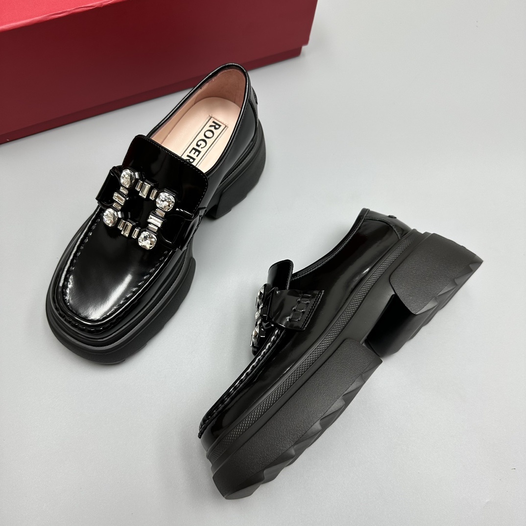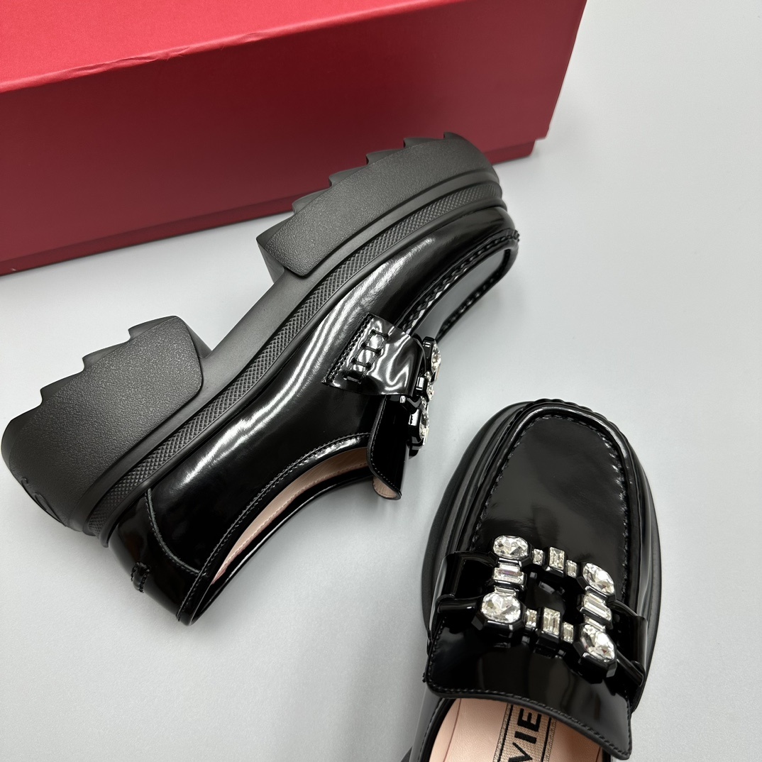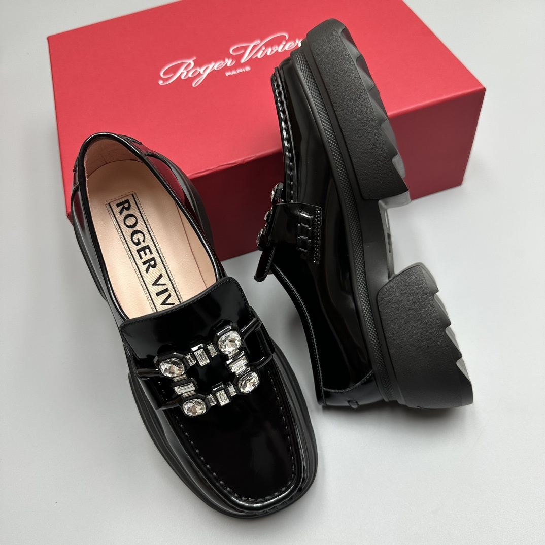 로저비비에 RV 추동 신상 왈라비브 큐빅 로퍼 Wallaviv 컬렉션을 통해 브랜드가 일관되게 우아함과 개성이 돋보이는 통굽 디자인으로 샤이니한 에나멜 가죽으로 제작되었으며 사이드 몰딩이 샤이니한 큐빅 버클로 포인트 미끄럼 방지 고무 아웃솔이 편안함 앞면 수입 트임 구슬 안감 무스탕 오리지널 고무발포대창 굽: 5cm