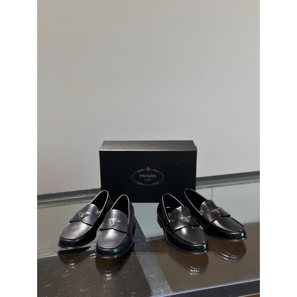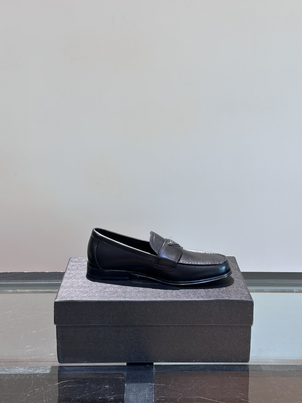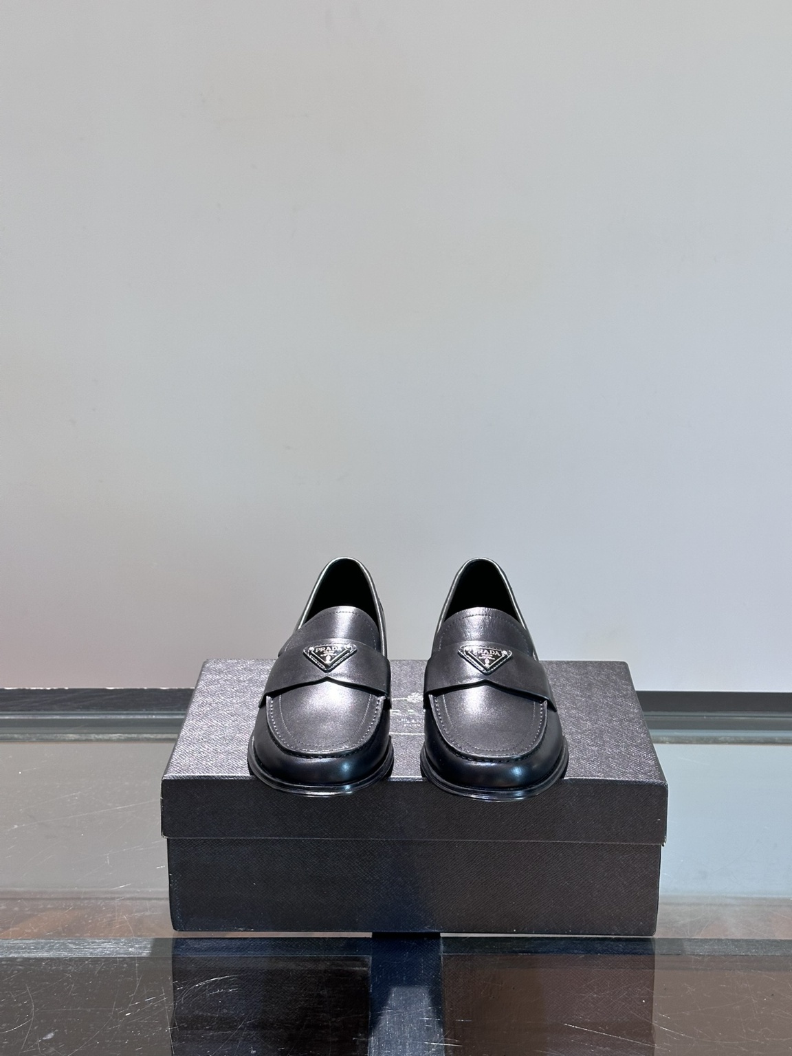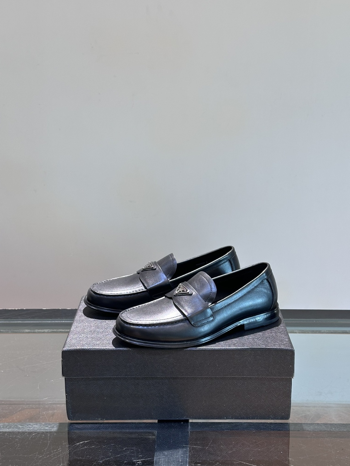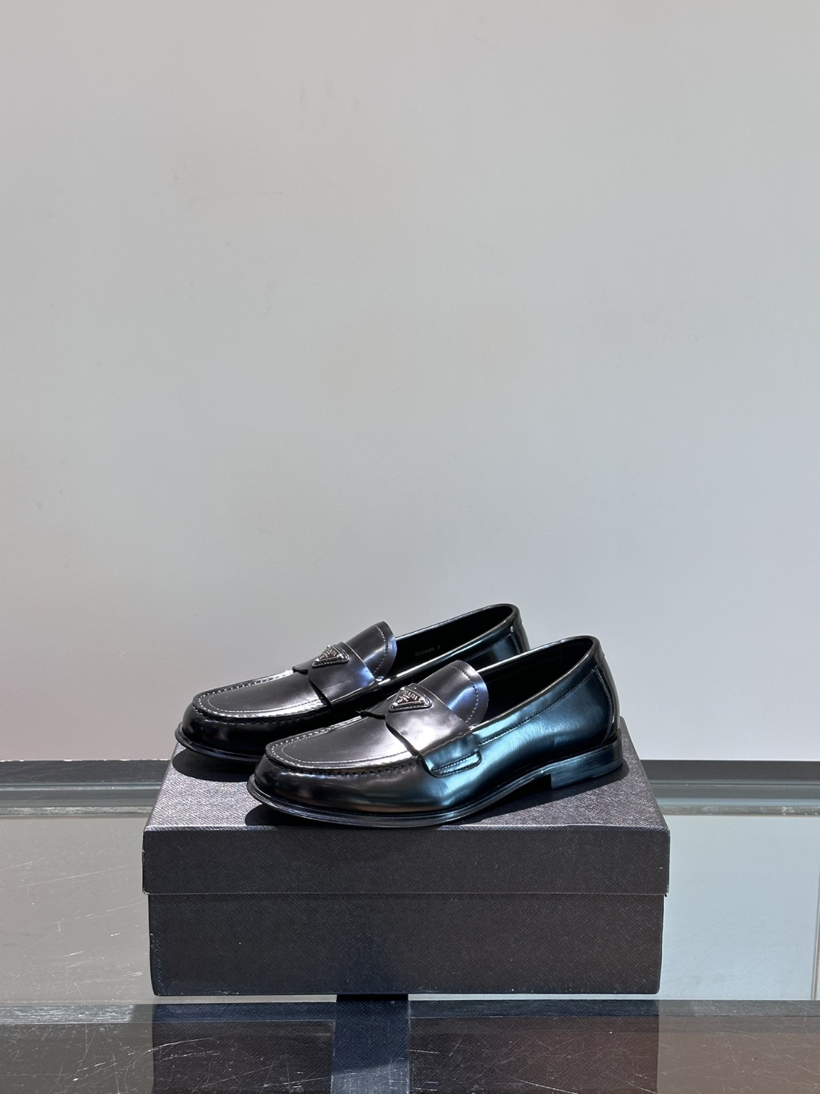 프라다의 클래식한 천연가죽 통굽 정장 캐주얼 구두 수입 소가죽으로 가죽의 결이 곱고 컬러가 밝고 볼륨감이 있으며 스티치 디테일이 세련되어 고급스러움 안감은 본염 송아지 가죽에 소가죽 깔창 로고 디테일 수입 리얼 가죽 대창과 발끝이 기품있는 스타일